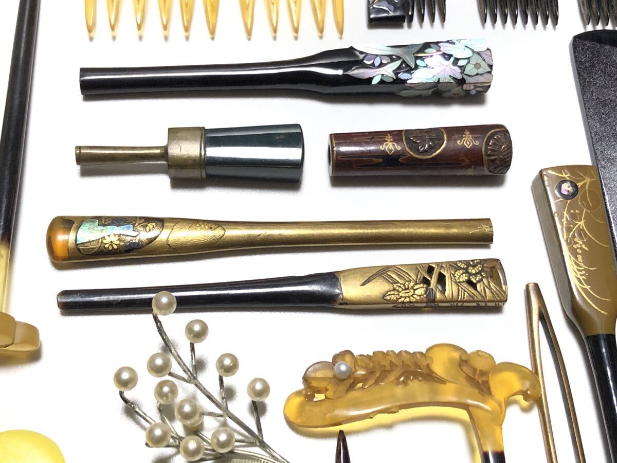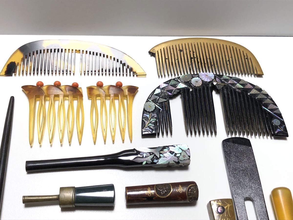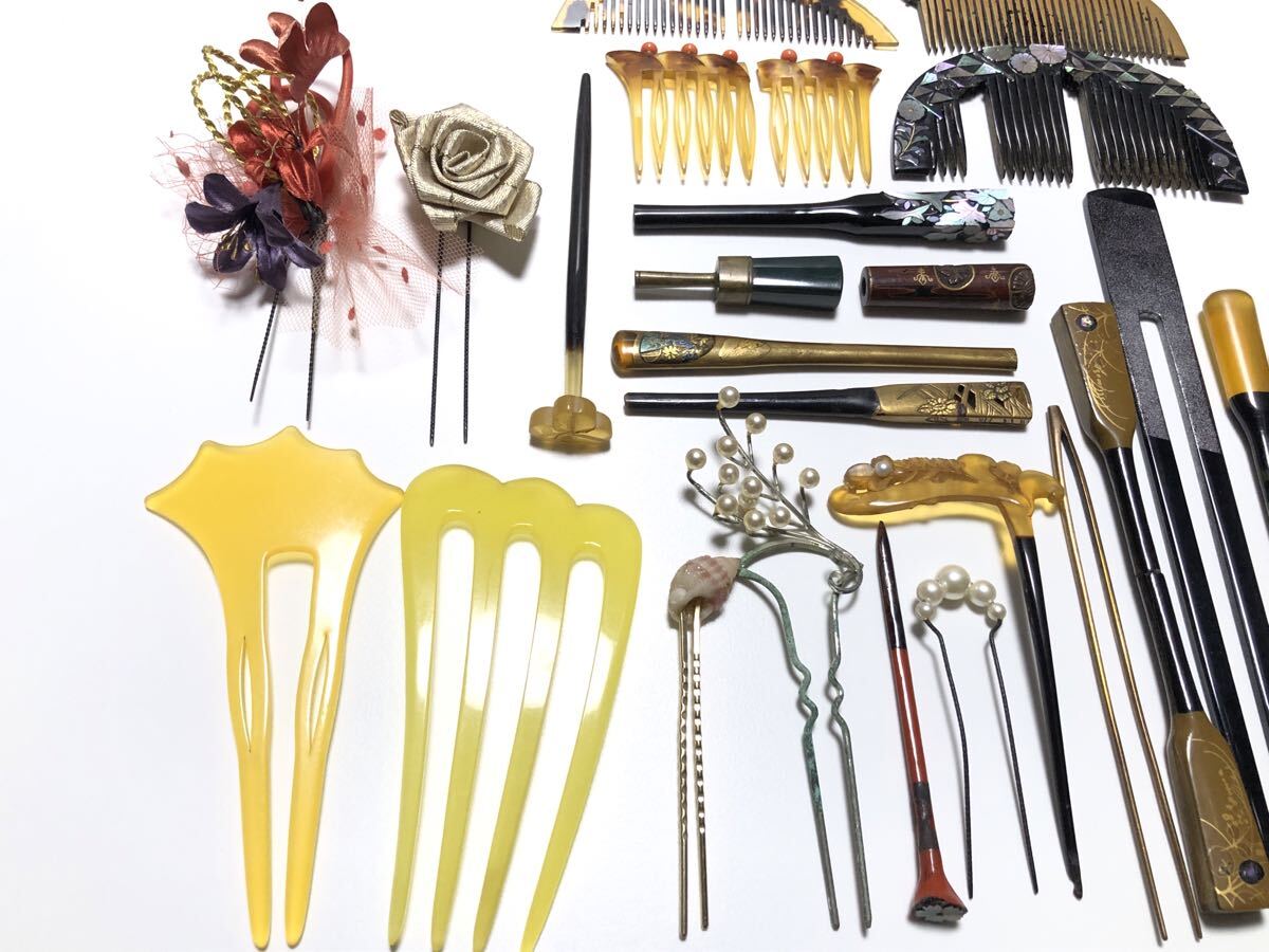 アンティークの本鼈甲、鼈甲張、鼈甲風、木製を使用した簪、櫛、笄25点です。ほとんどが虫食い、折れ、欠け、サビ、一部のみなど難あり品です。修復、パーツ取りなどにご利用下さい。