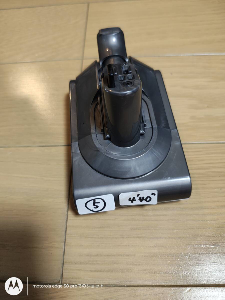 フル充電でテスト用のクリーナーヘッドを床に密着させて負荷をかけた状態(強運転)で4分40秒稼働しました。