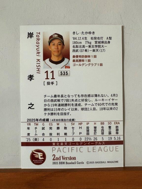 【2025 BBM 2nd】535岸孝之(東北楽天ゴールデンイーグルス)レギュラーカード※キラカード版