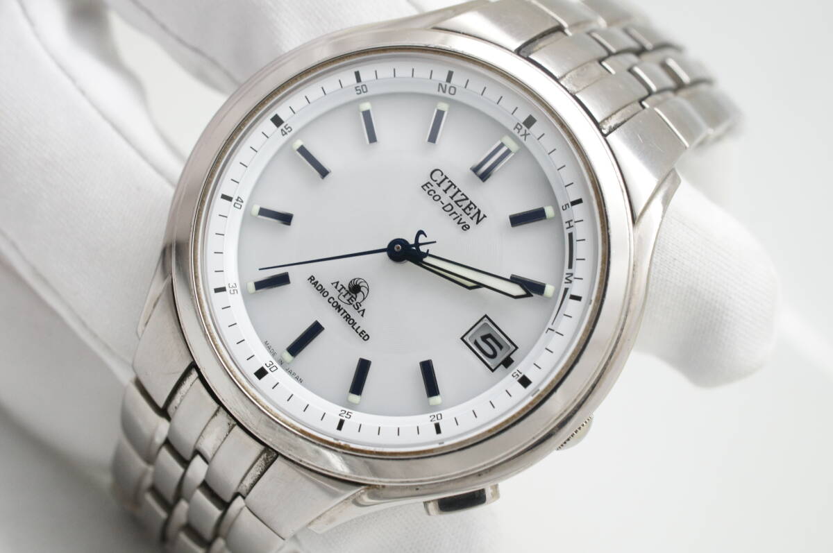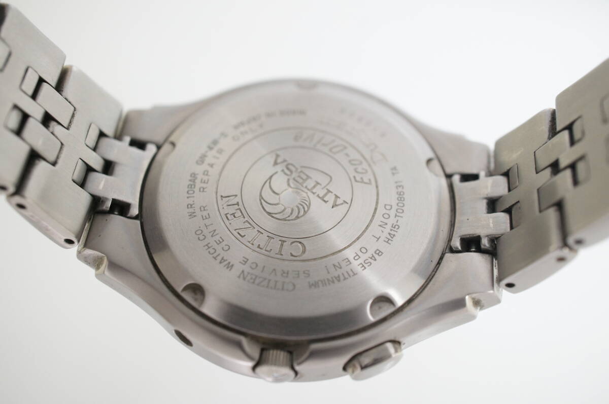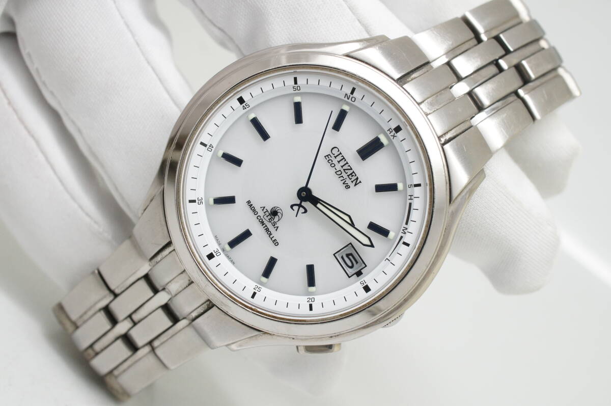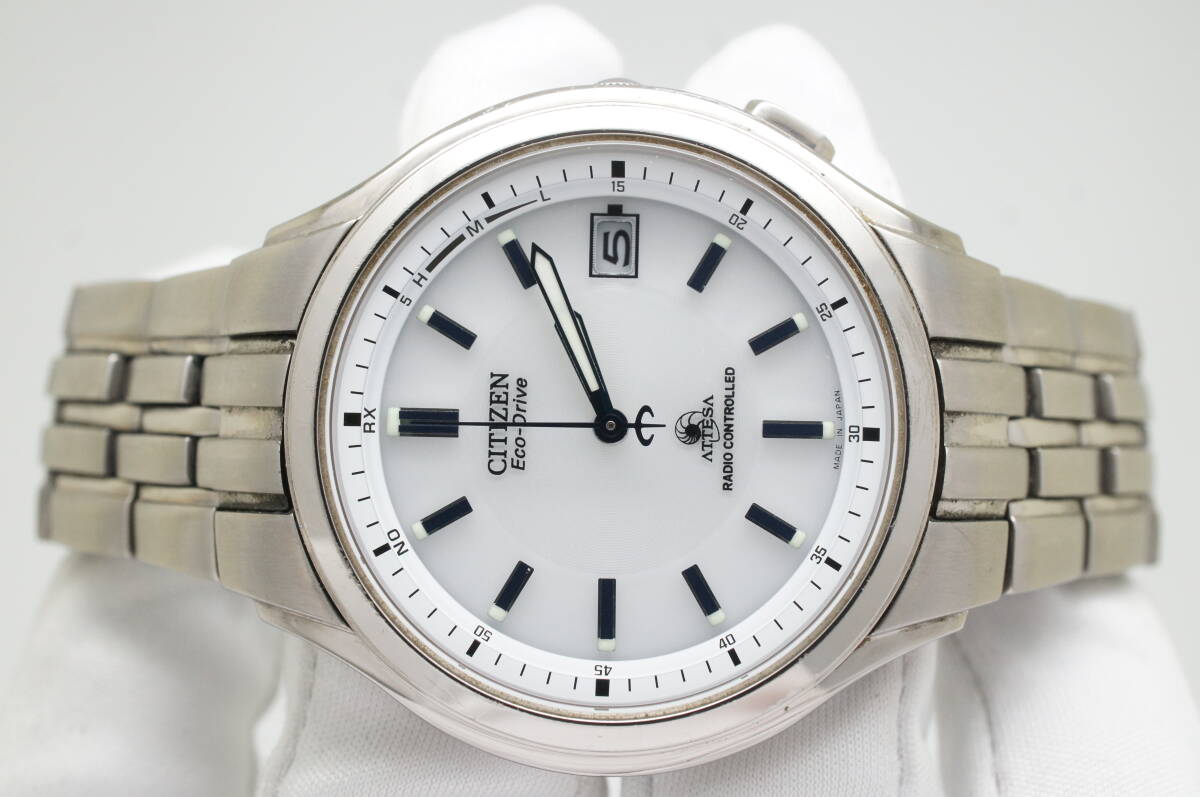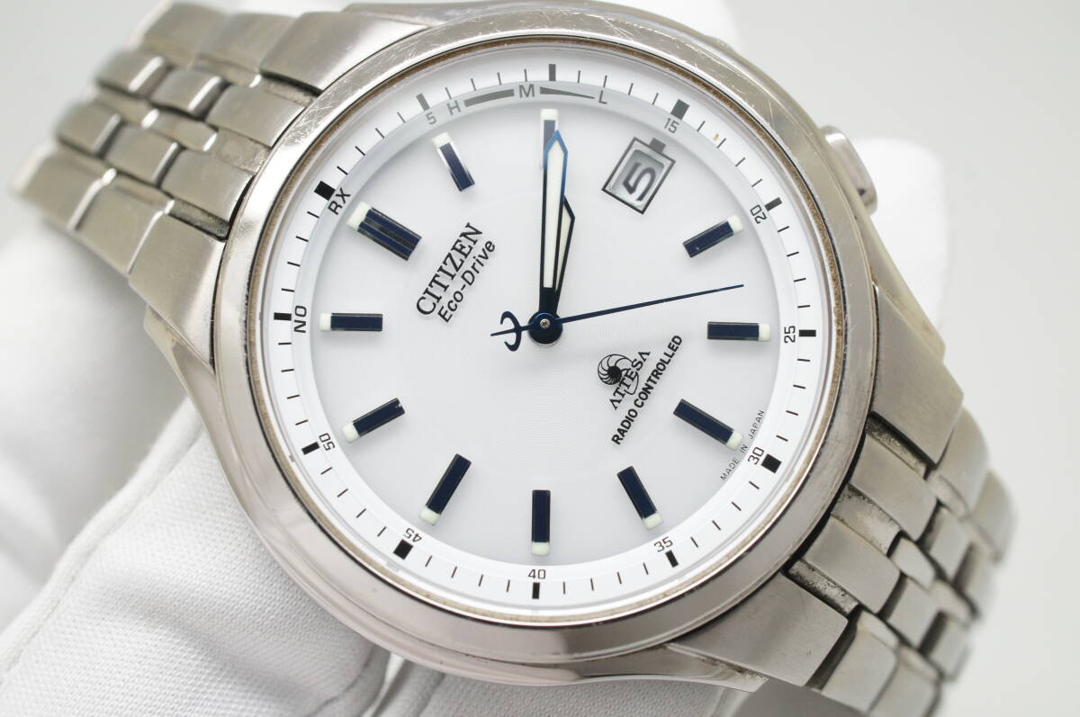 Z37●作動良好 CITIZEN シチズン ATESSA アテッサ エコドライブ 電波ソーラー H415-T008631 TITANIUM チタン 白文字盤 デイト メンズ腕時計