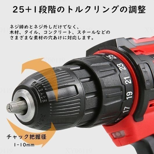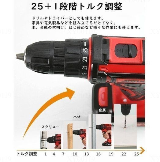 【最大トルク40Nm・25+1段階トルク調整】:この電動ドライバーの最大トルクは40 Nmです。25+1段階トルク調整は、異なる動作に適用されます。回転速度は高(0~1350 rpm)、低(0~350 rpm)の2段階で調整できます。トリガースイッチの力を押すことで無段階変速ができ、回転速度が調整されます。