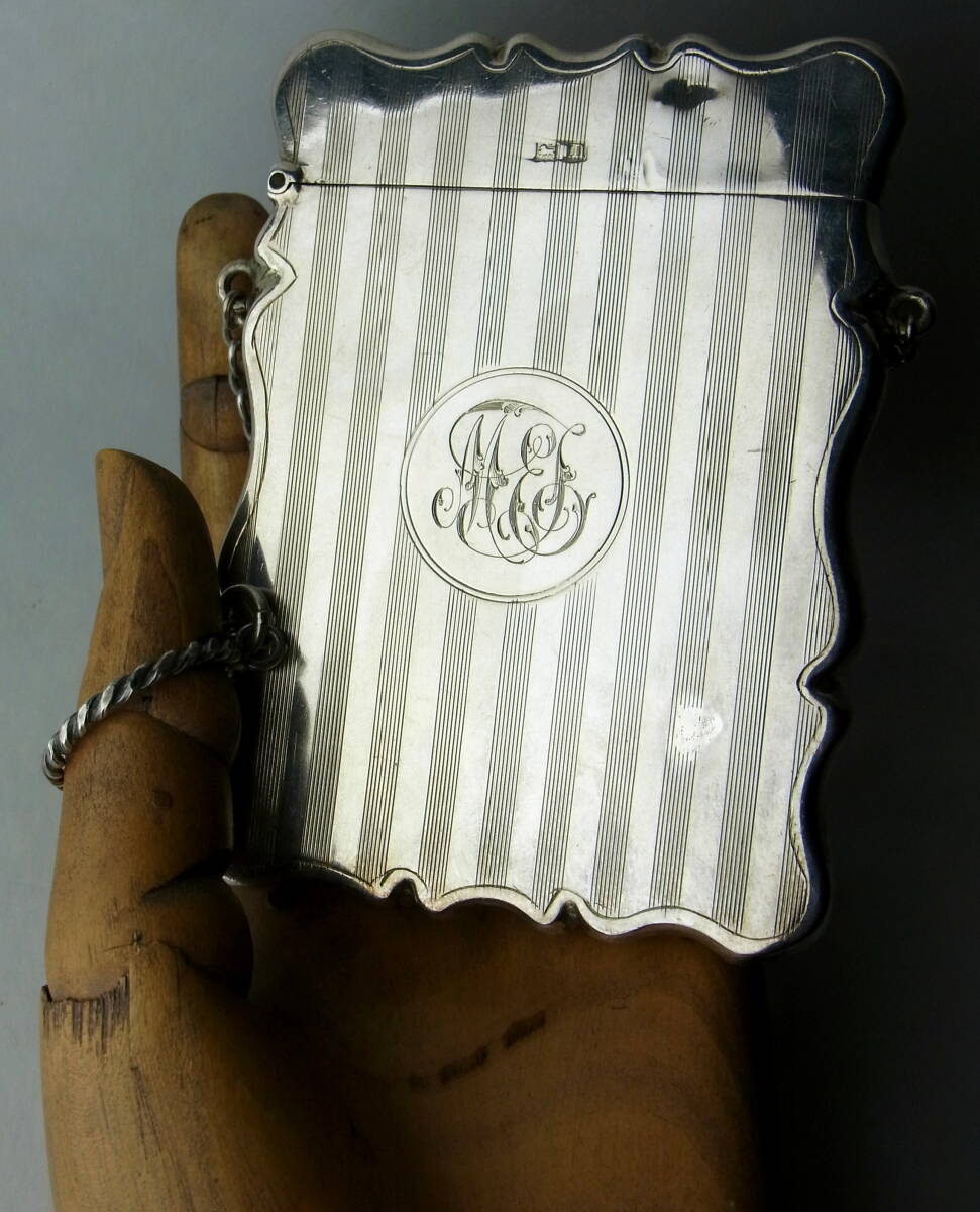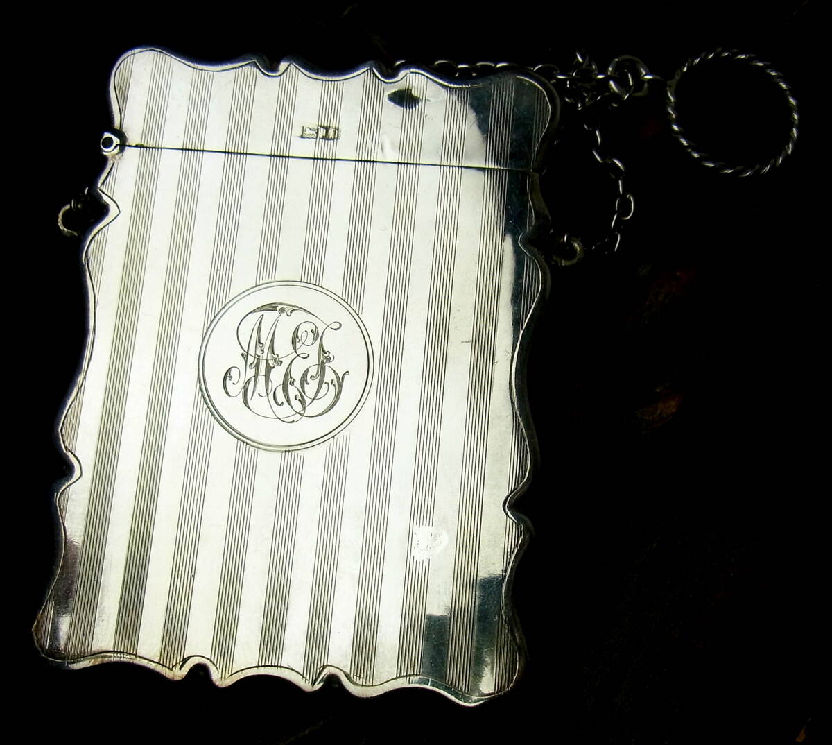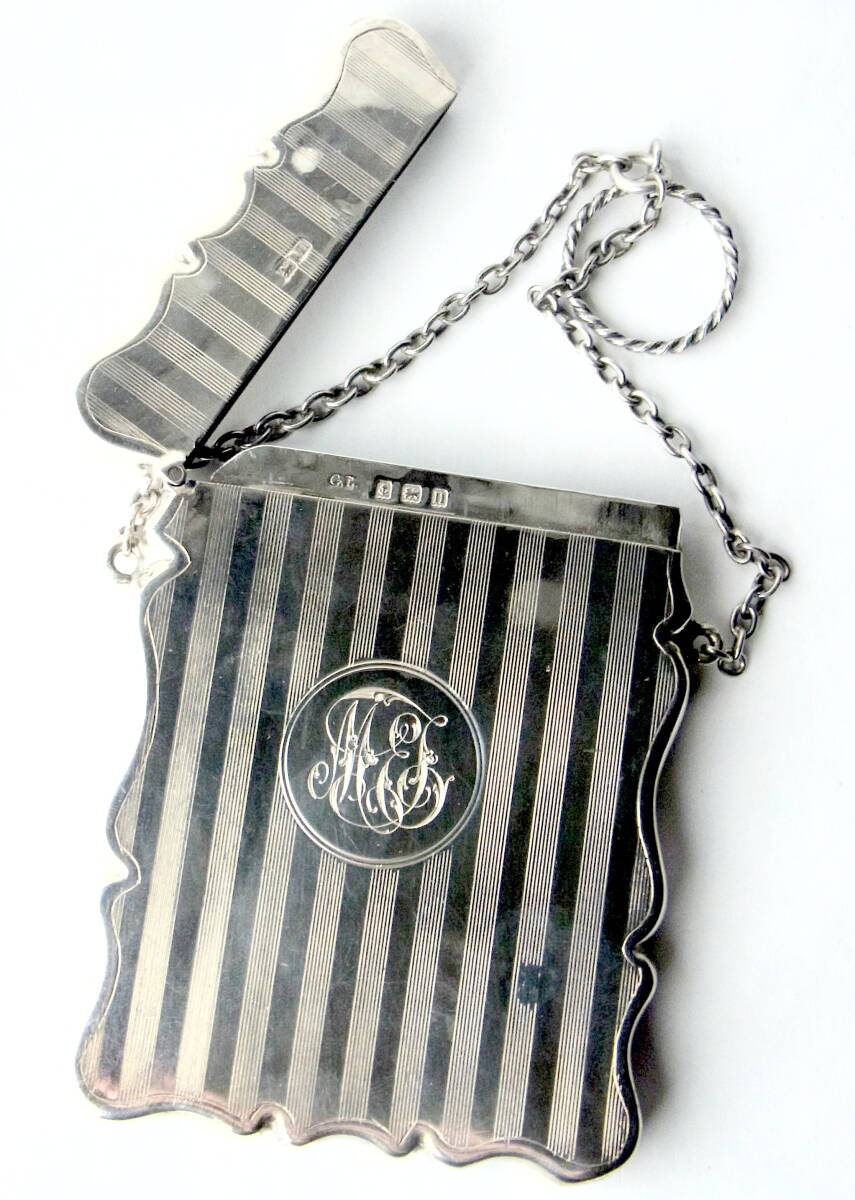 美 イギリスアンティーク 純銀スターリングシルバー カードケース チェーン付 G Loveridge & Co モノグラム バーミンガム 1912年 英国骨董