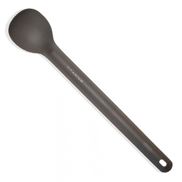 とても硬くて軽量なチタンを使用した、バーゴのロングハンドル スプーン。長さが22cm程あり、深い瓶やレトルト食品などから手を汚さずに取ることができます。柄の端には「TITANIUM」の文字とバーゴのロゴが入っており、端には穴が開いており紐を通すことが可能。とても軽量なので、アウトドアなど持ち運びに邪魔になりません。