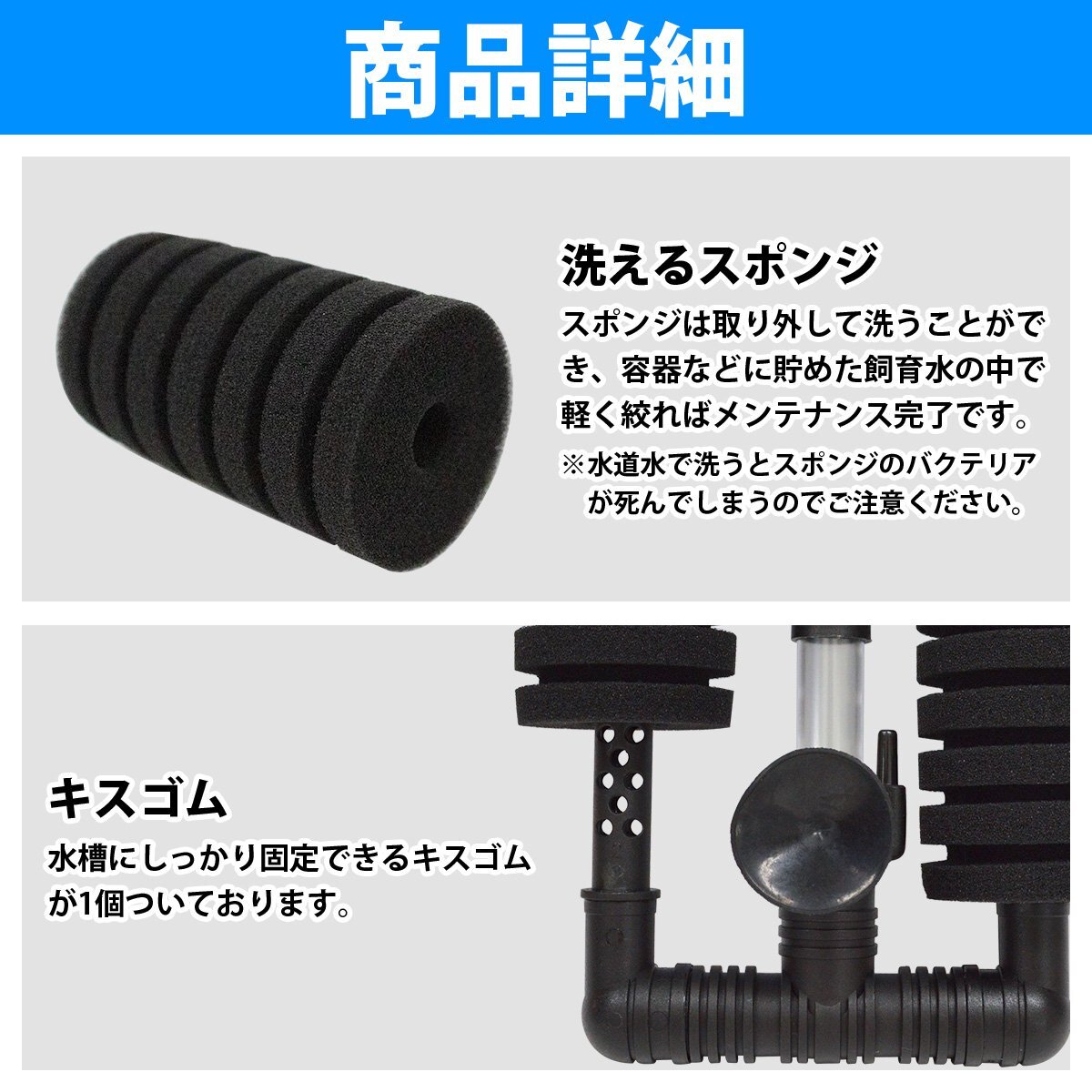 吸水口がスポンジで覆われており、魚を吸い込まないため稚魚水槽やグッピー、ベタなどの飼育にも適しています。