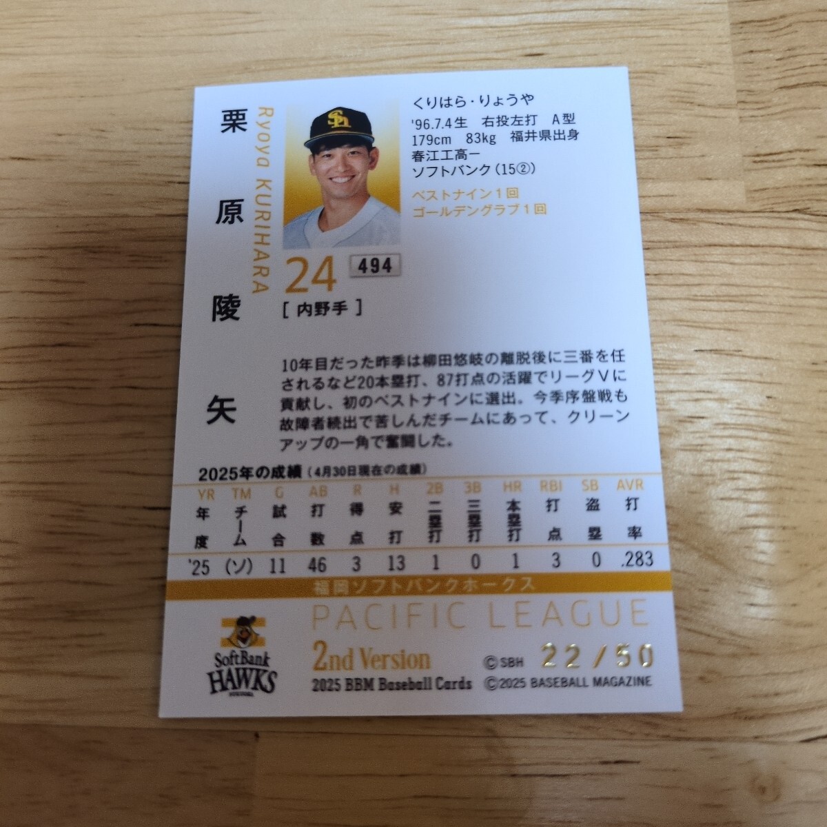 2025 BBM 2nd セカンドバージョン 栗原陵矢 ホロ箔サインパラレルカード (/50) 福岡ソフトバンクホークス
