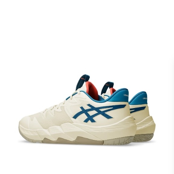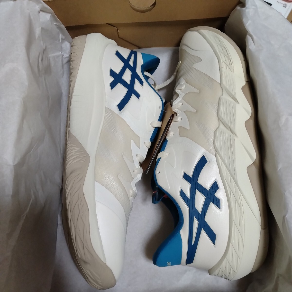 ASICSのバスケットシューズ、クリームとブルーの配色で、ラバーソールが特徴。