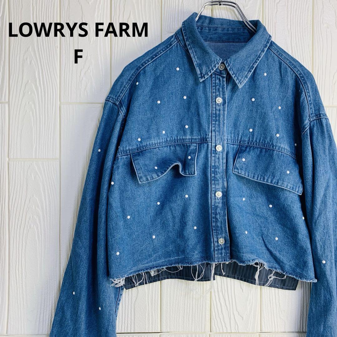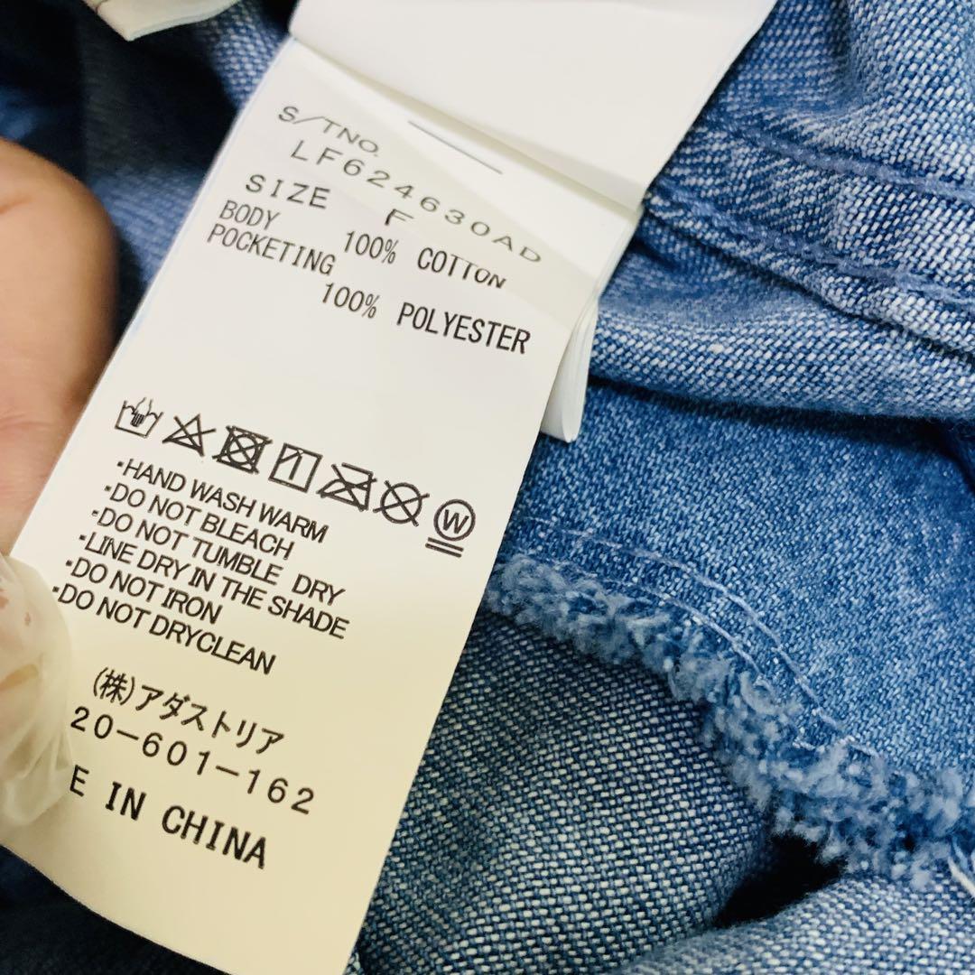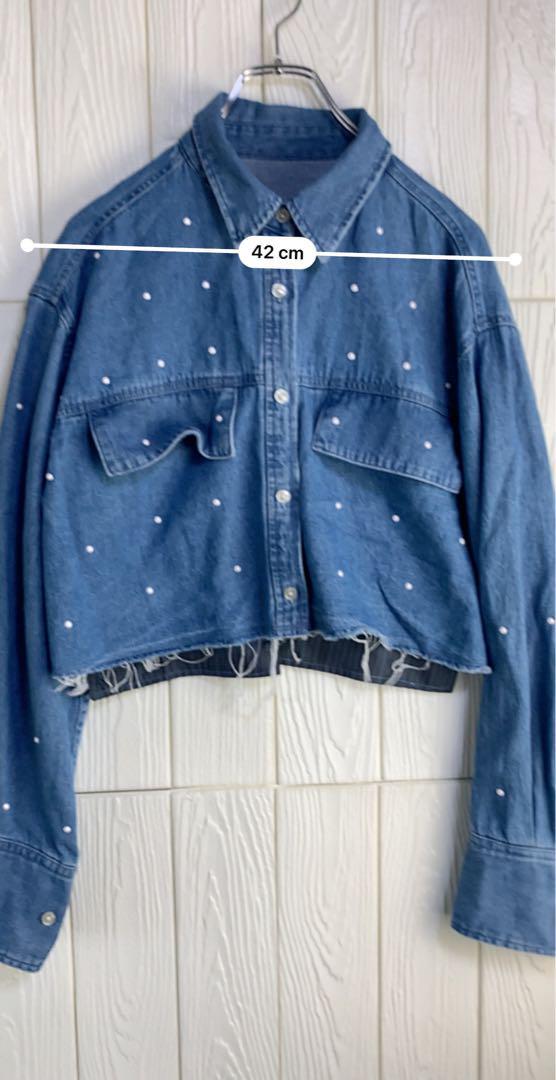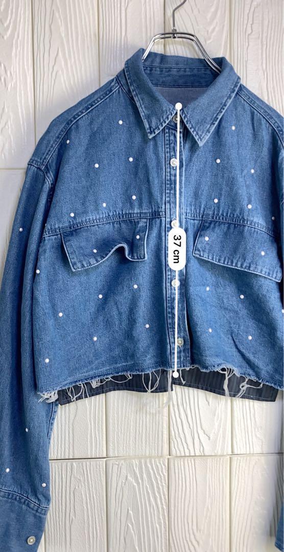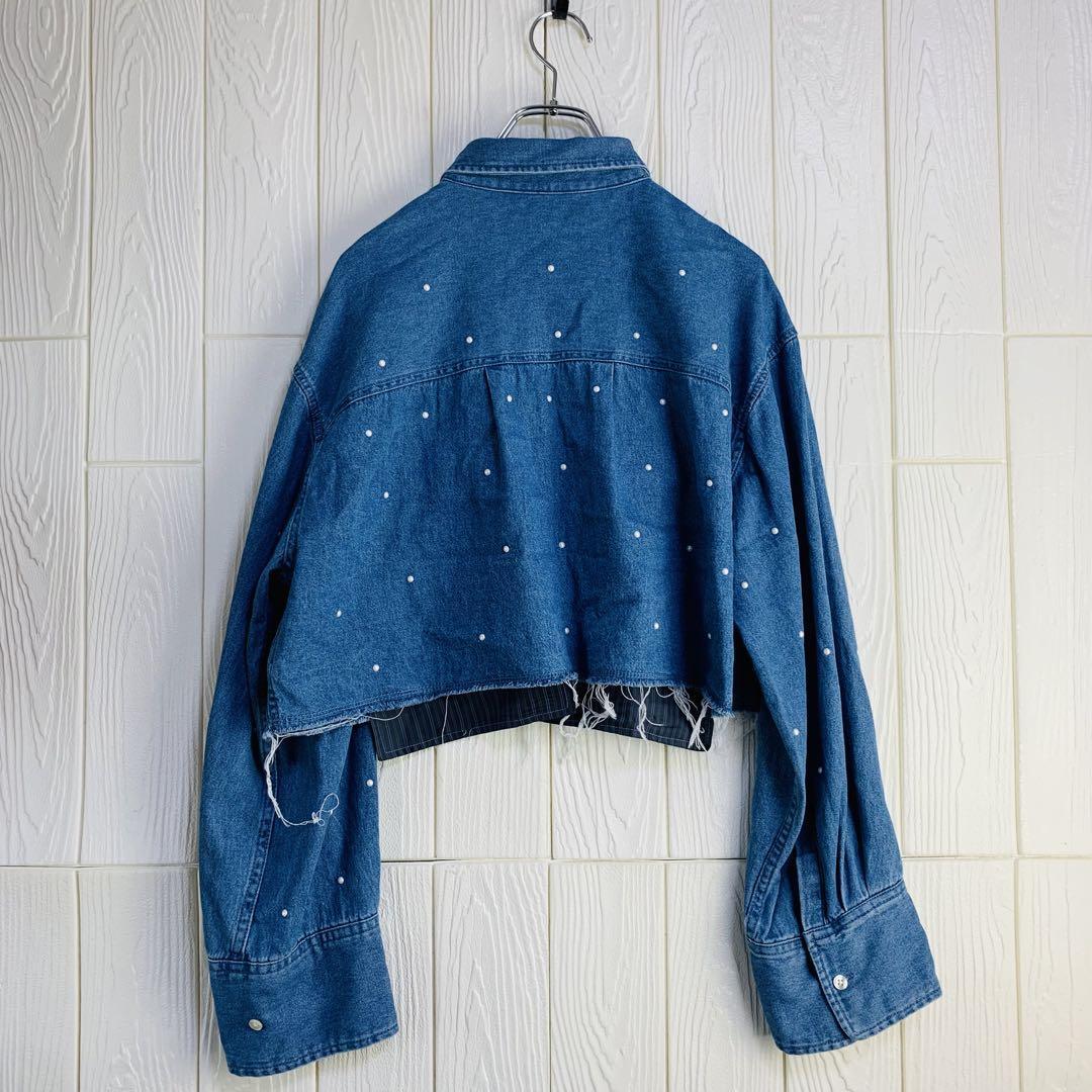 デニムブルーのクロップドジャケット、パール装飾付きでスタイリッシュ。