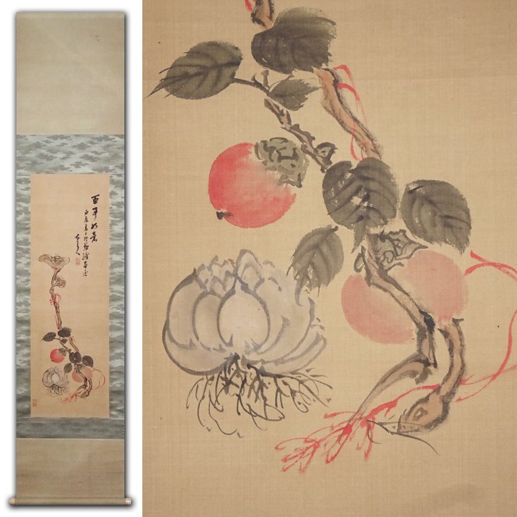 本物保証!         代々丸岡藩家老職をつとめる家の生まれで、京都にて富岡鉄斎に南画を学び、後に細谷立斎に花鳥山水画を学ぶ。 田近竹邨、池田桂仙と共に大正時代の南画壇の三元老として活躍した南画家【山田介堂】(1870-1924)真筆。   絹本着色『百事如意』です。       落款、朱印あり。   合わせ箱付。       経年によるヤケや小シミ、表具巻留め部の切れ等見られますが、総じて目立つような傷みは無く良好な状態といえます。          正真正銘本物保証!