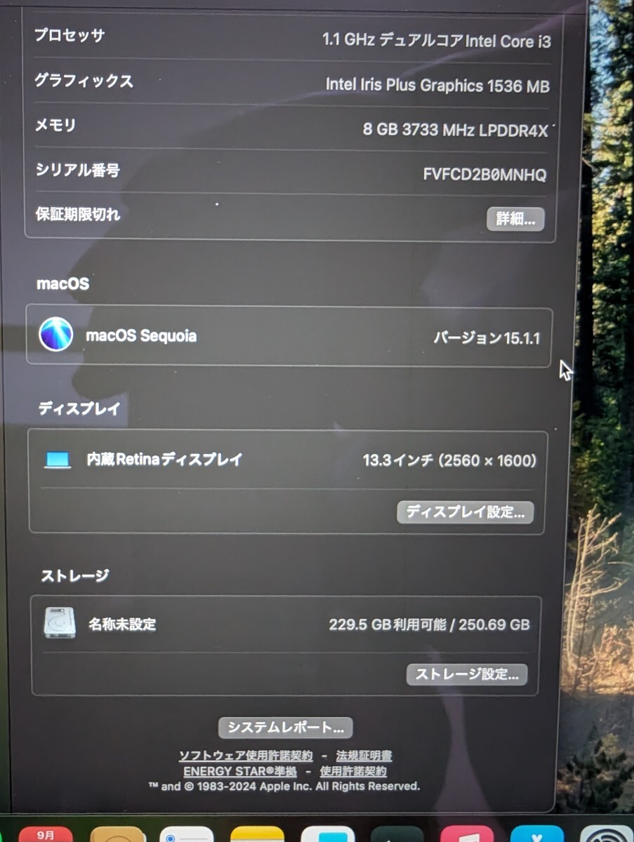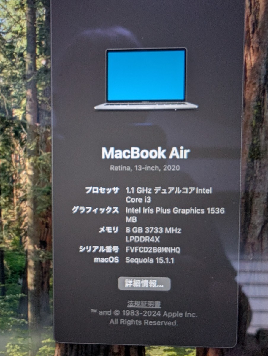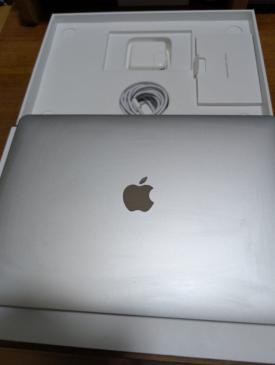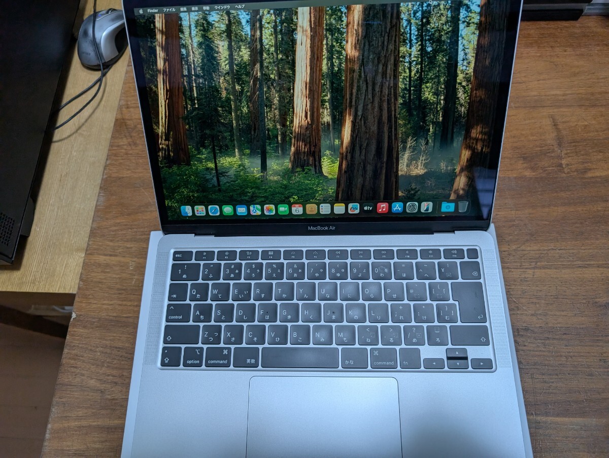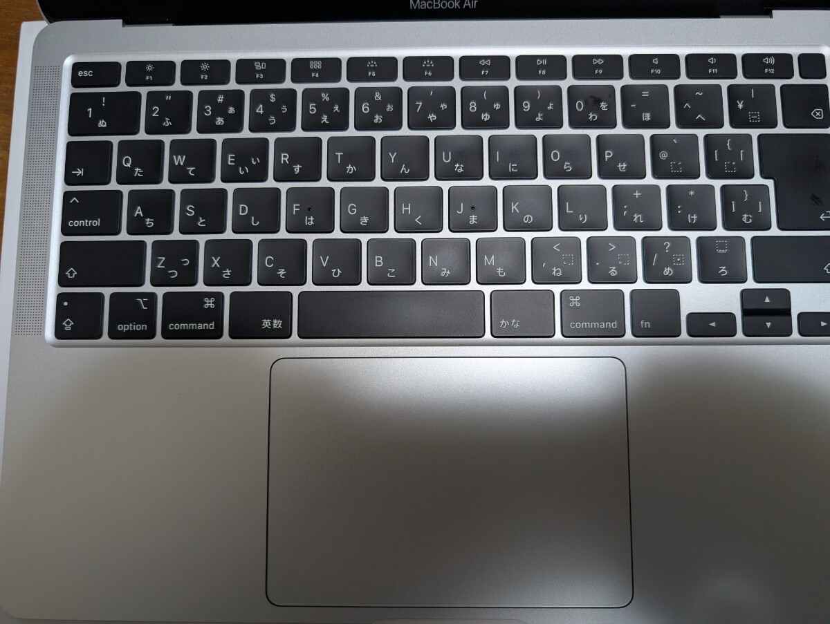 外観は打痕もなく綺麗です。キーボードに若干のテカリがありますが、文字消えも無く状態良好です。液晶の縦線がなければ、intelMacbook Air最後のモデルですので使いたかったのですが、出品して別のモデルを買うことにしました。