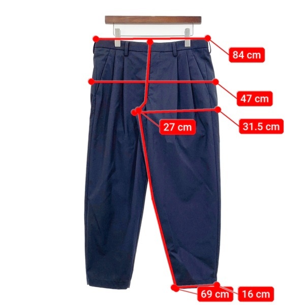 実寸法 | ボトムス実寸 ウエスト:84cm 股上:27cm 股下:69cm もも幅:31.5cm 裾幅:16cm |
