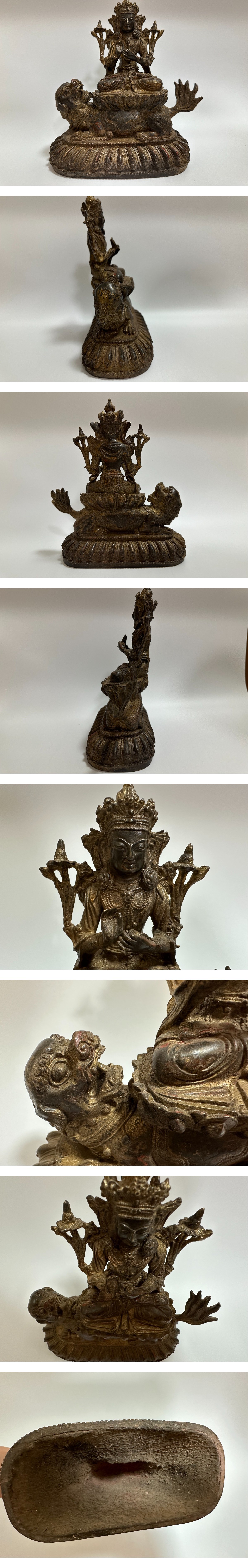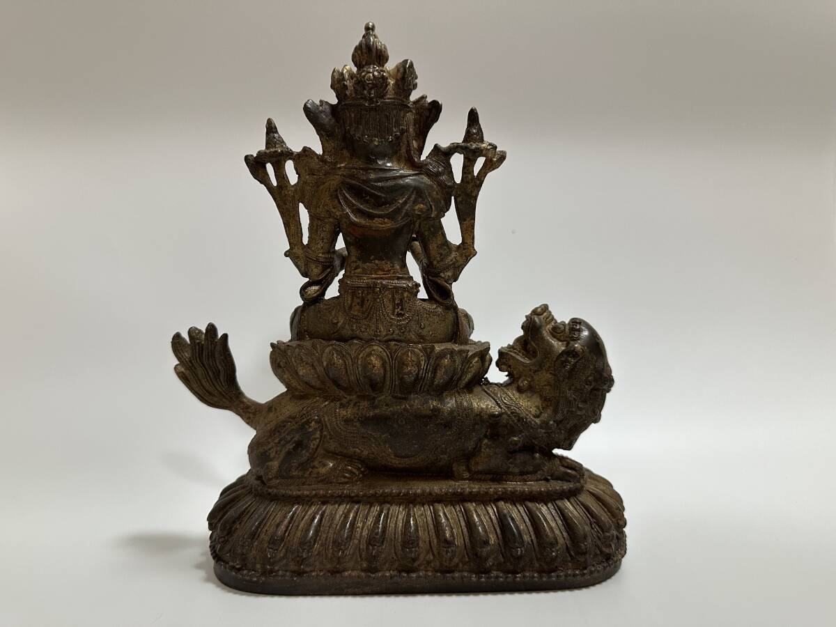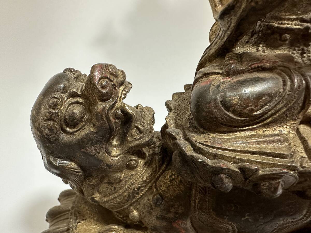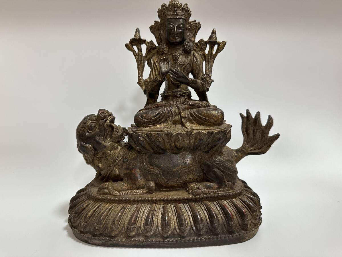 時代 仏教美術 文殊菩薩造像 獅子 座像 高23㎝ 細工彫刻 銅製 旧物 仏教古美術 銅仏像 古美術 2114g