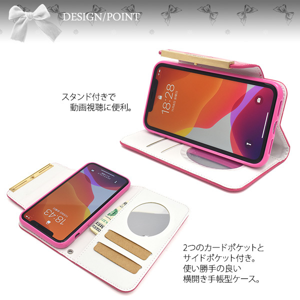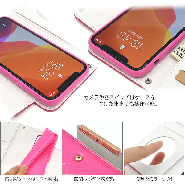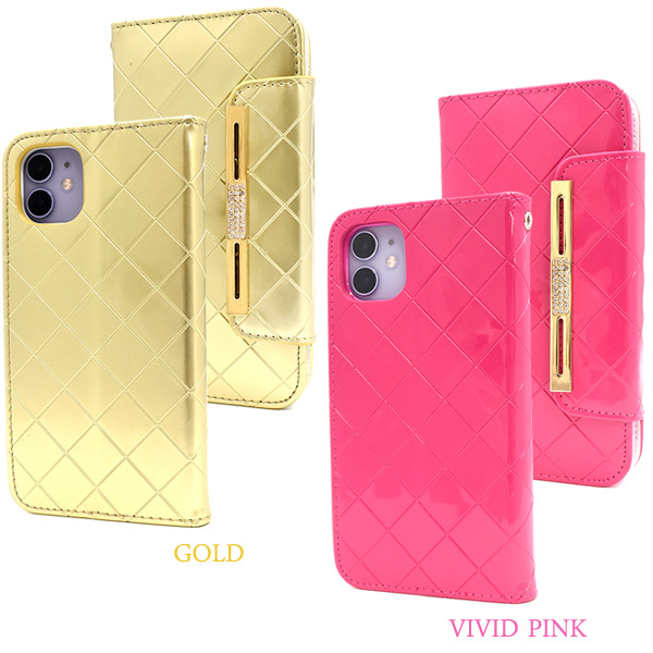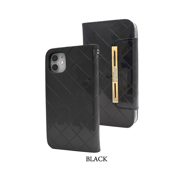 エナメルの光沢とラインストーンがエレガント感を演出してくれる手帳型ケースです。