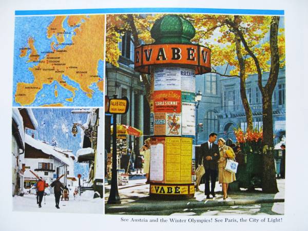 日本人の海外旅行が自由化(1964年)される前年(1963年)なので、日本人はまだ海外旅行が自由に出来ない時代に、自由に海外旅行が出来たアメリカ人観光客向けのヨーロッパ観光旅行の広告です。