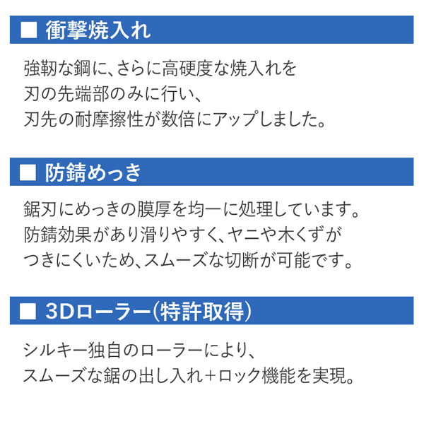 | ■ アサリ無し アサリを分ける代わりに鋸刃を曲面研磨して、鋸自体の厚みでアサリを作り出してあります。 アサリ分けが無い刃は切り口に引っかき傷を付けません。 そのため切り口はなめらかになり、雨水などで濡れても乾燥しやすいので腐りにくくなります。 ■ 未来目 アサリ分け無しタイプに採用した未来目という特殊目立てを施してあるため、縦・横・斜め方向への切断がスムーズに行えるので、繊維の交わった枝の根元や、一般木材、集成材、合板などが楽に切断できます。 ■ 衝撃焼入れ 強靭な鋼に、さらに刃の先端部にのみ衝撃焼入れを行い、 刃先の耐摩耗性を数倍アップしました。 ■防錆メッキ 鋸刃にメッキの膜厚を均一に処理しています。 防錆効果があり滑りやすく、ヤニや木くずがつきにくいため、スムーズな切断が可能です。 ■ ゴムグリップによる効果 ゴムグリップによって、力を逃がすことなく、100%引く力を刃に伝えることが出来るようになります。 手袋をしていても、汗をかいても、すべりを起こさせないハンドルです。 |