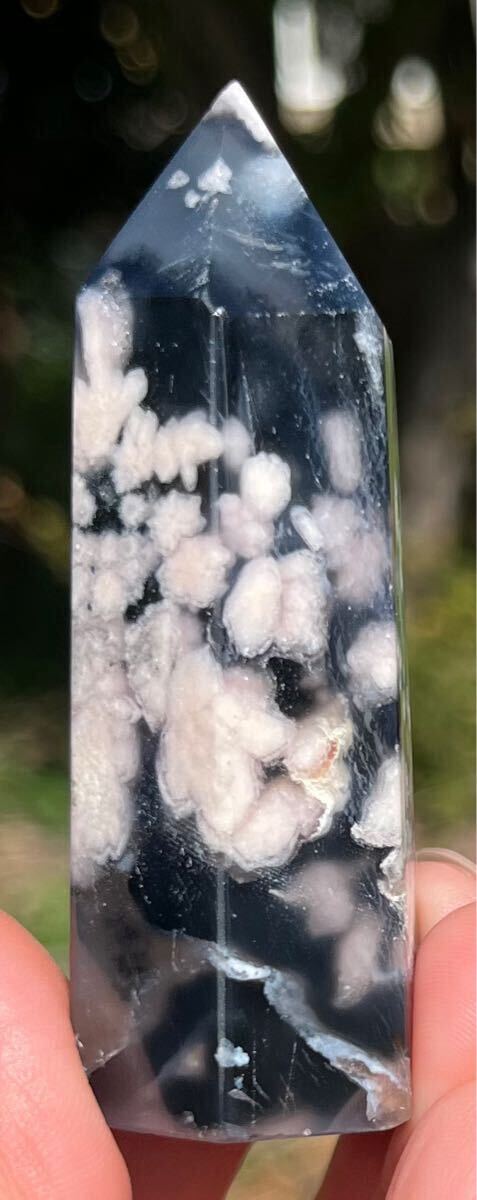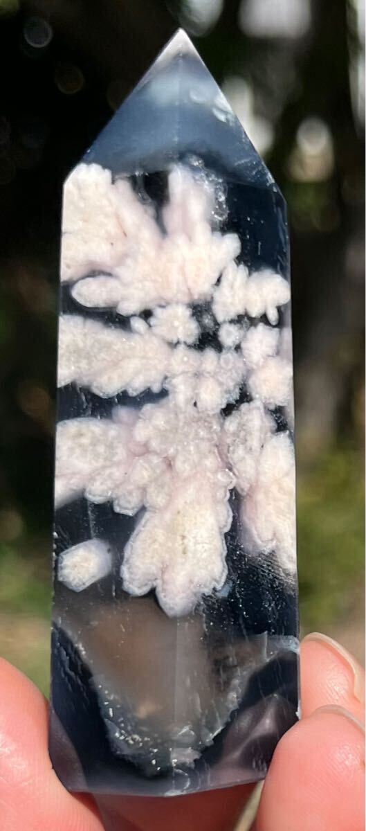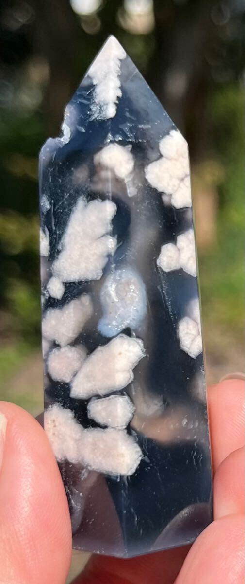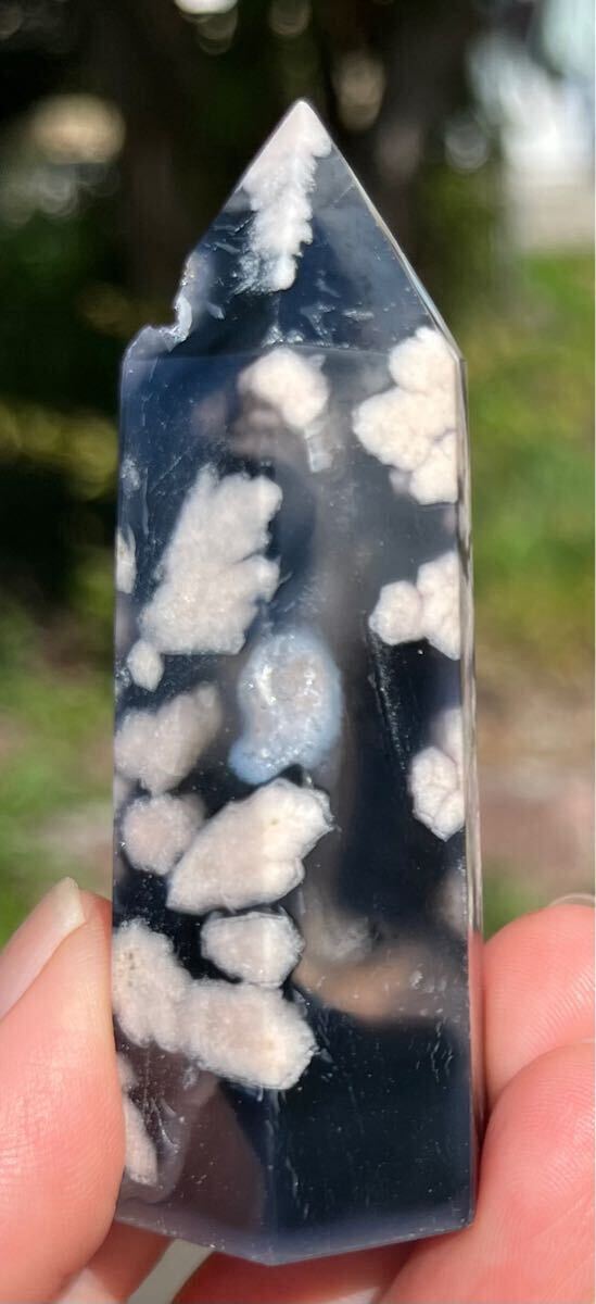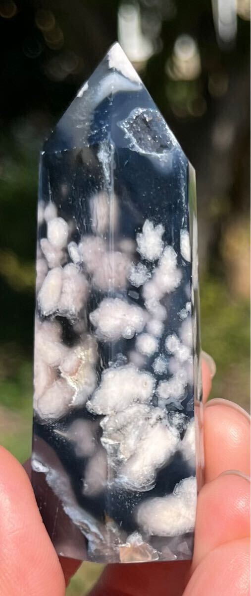 縦約71mm 横約27mm 厚さ約23mm 重さ約64.3g ご覧の様にインディゴブルーがフラワーの美しさを更に引き立てる逸品で、トップと底面とサイドにあるドル-ジ-は光が当たると煌めきます。フラワーアゲートは運気の流れを良くしたり、