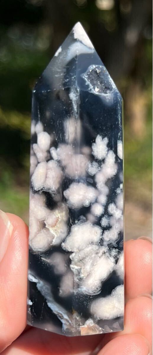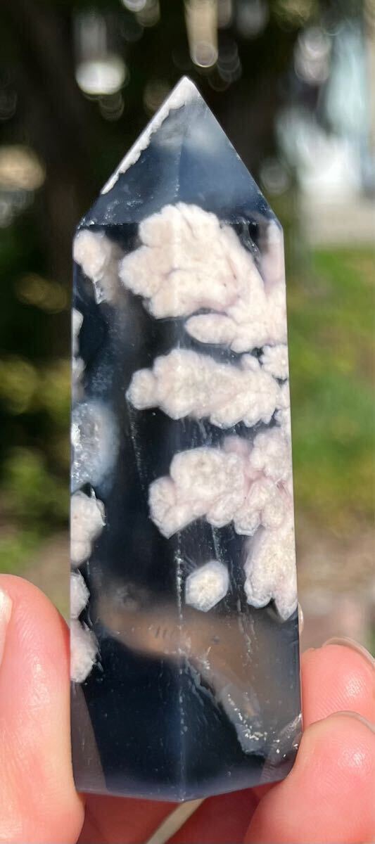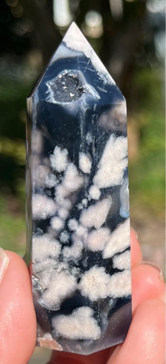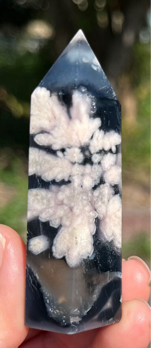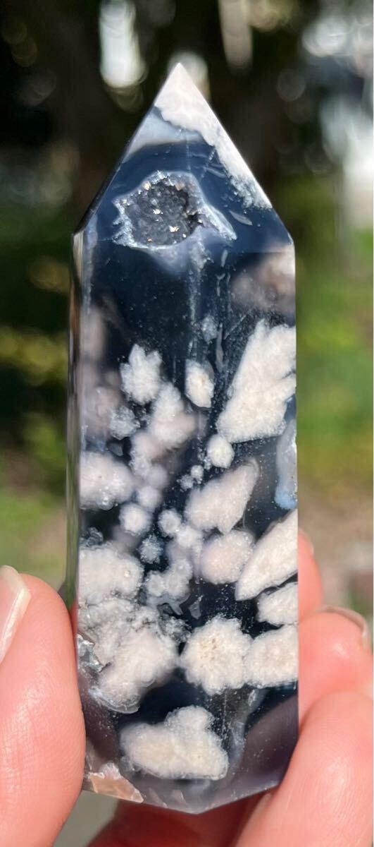 縦約71mm 横約27mm 厚さ約23mm 重さ約64.3g ご覧の様にインディゴブルーがフラワーの美しさを更に引き立てる逸品で、トップと底面とサイドにあるドル-ジ-は光が当たると煌めきます。フラワーアゲートは運気の流れを良くしたり、