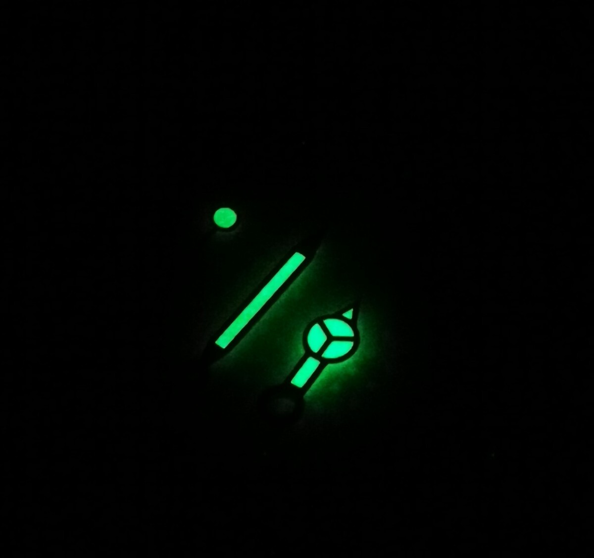 カラーはゴールドで夜光の色はホワイト、発光色はグリーンになります。