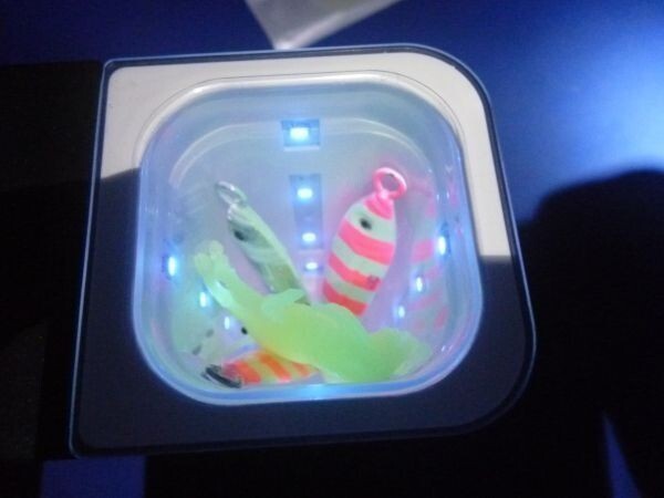 | 商品説明 | 差し込むだけで全方位蓄光 内部(4面多段)に多数のUVチップが実装済みなので差し込んでスイッチを入れるだけで周りから全体的にムラなく蓄光されます。 参考写真の使用例の白(夜光)ザリガニは桁外れの驚異の蓄光性能です。 夜蛸に絶大な支持を頂いております。(別途出品中) 大きさ 12cm×9cm×6.5cm スロット深さ 11.5cm×5㎝×5㎝(底水抜き穴) UVLED個数 4面4個=16個 底には水抜き穴もあります。 250g 単4電池2本使用(別売) ロッドホルダーやタックルボックス、クーラー等に固定可能です。 ボタンを押すだけで全方向からUV光が照射されるため、釣り場に到着前に蓄光完了できます。 使用例のザリガニは”特注タイプ”です。(驚異の蓄光モデル・・別途出品中) |