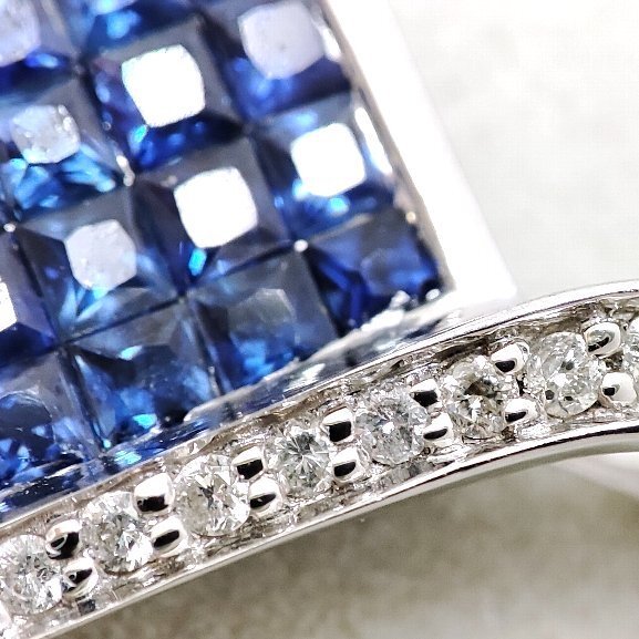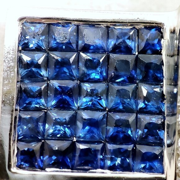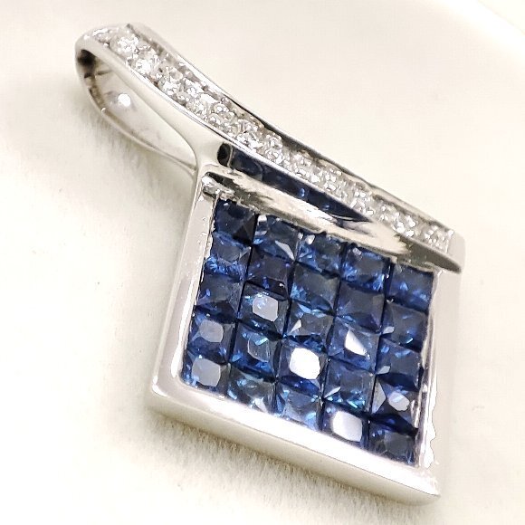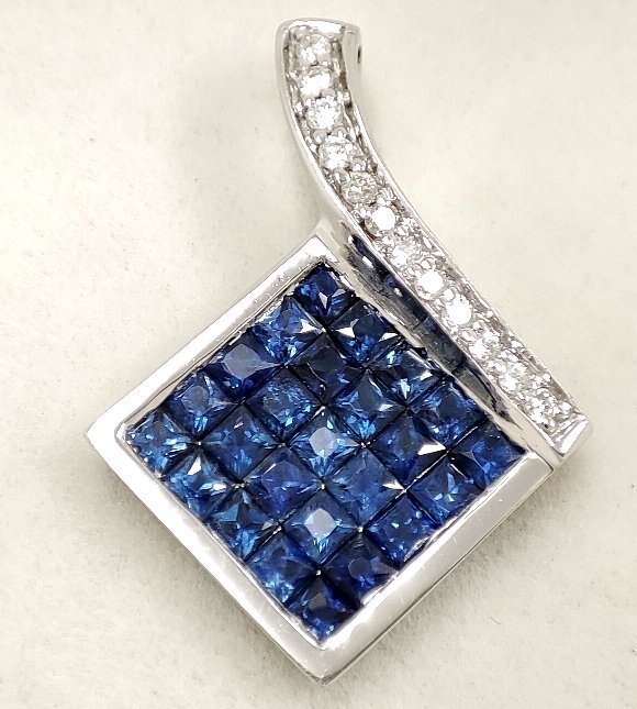 合計、1.00カラット スクエアカットの天然サファイアをミステリーセッティングで敷き詰め 石留めし、天然ダイヤモンドはサファイアに沿うように一列に石留めデザインされたペンダントトップです。サファイアは、若干のインクルージョンは確認できますが、カケや擦れキズは見られません。発色良く輝いています。ダイヤモンドのクラリティは主観になりますが、Iクラスになるかと思います。輝きはまずまずです。 |