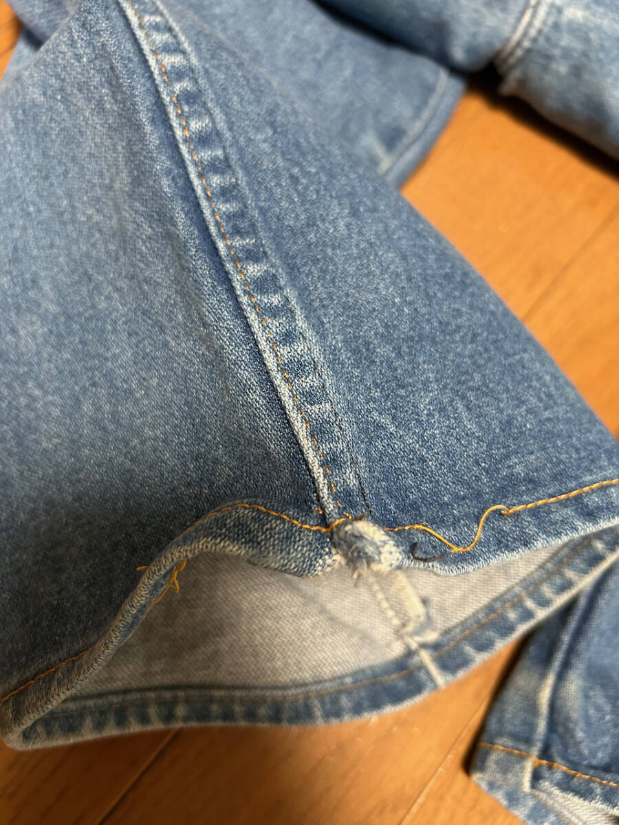 裾に解れ、パッチに割れ、レングスの長さが左右で約2cmほど異なります。
