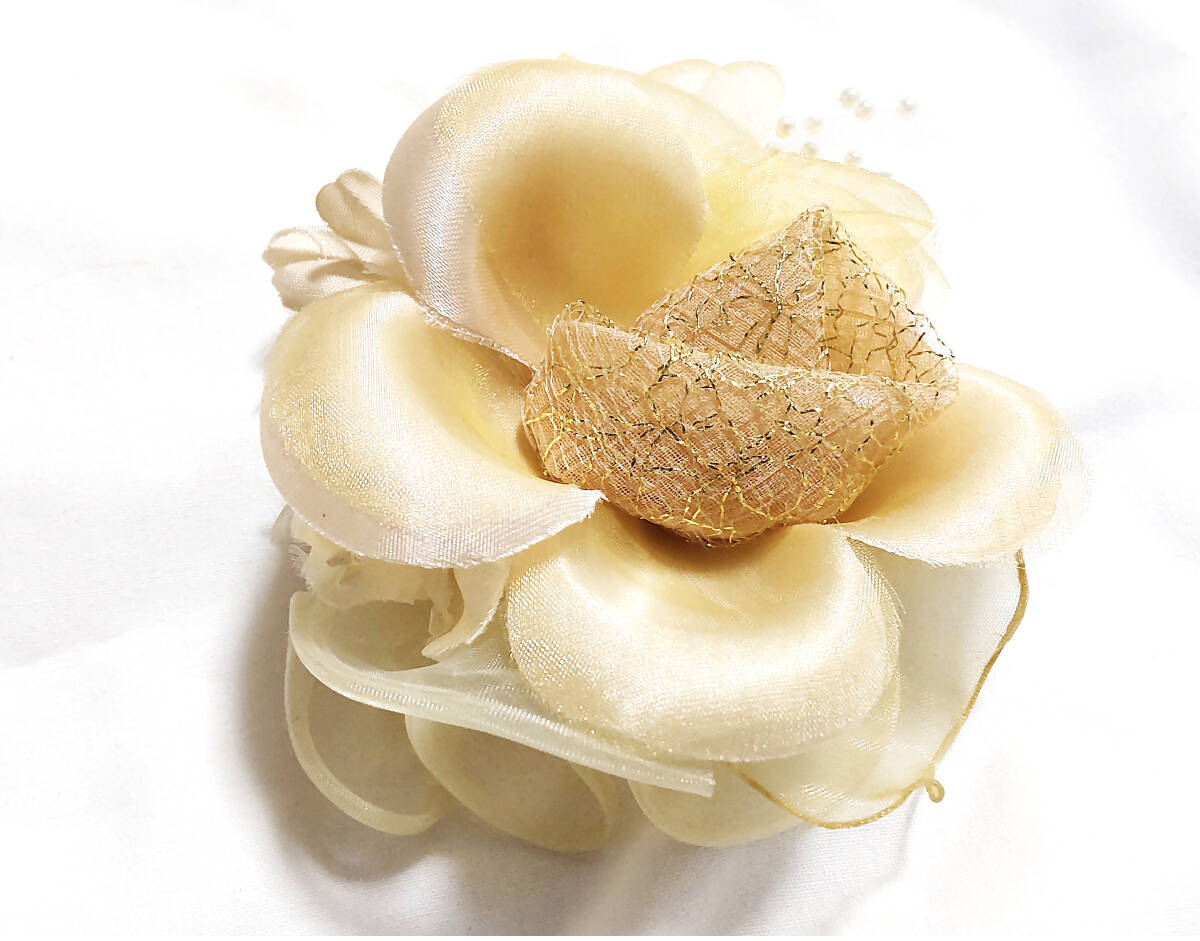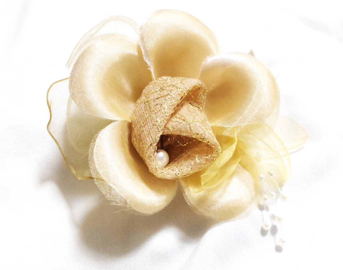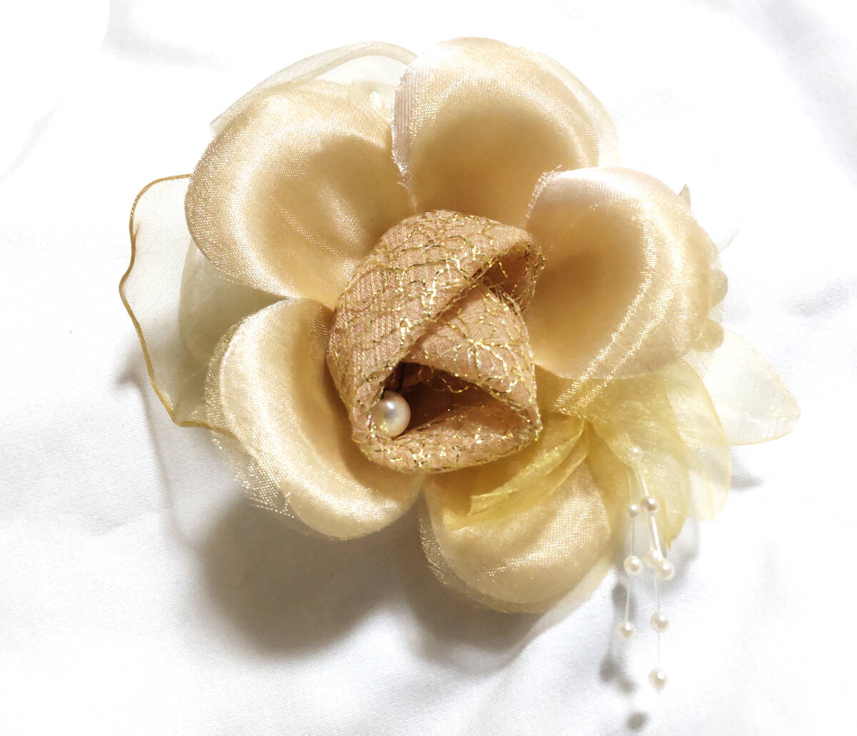 サテン風の光沢のあるゴールドのお花の花心にパールを一粒置いた華やかな印象のコサージュです。ブローチとしても使え、つけるだけでコーディネートに華やぎを作ってくれます。 サイズ(約/㎝):9.5×10、高さ4 | |