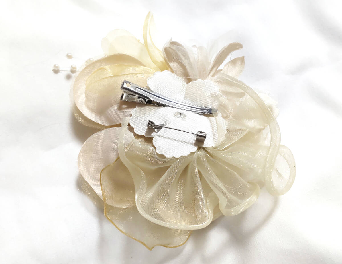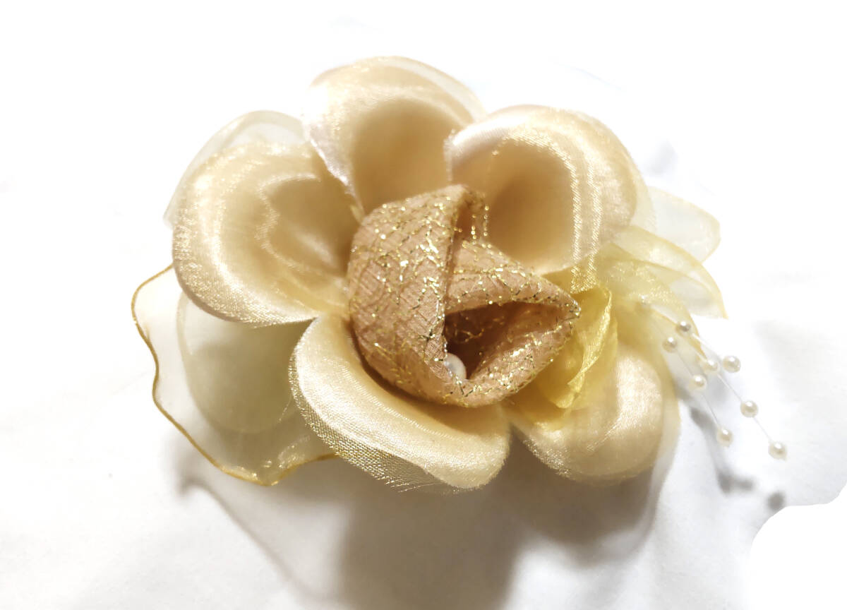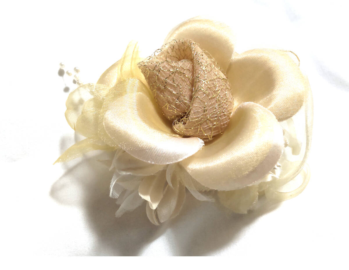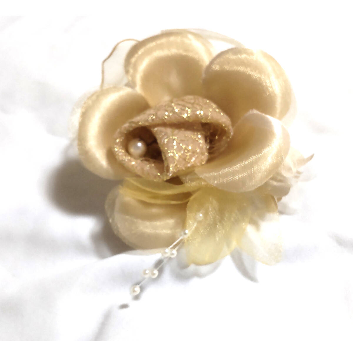 サテン風の光沢のあるゴールドのお花の花心にパールを一粒置いた華やかな印象のコサージュです。ブローチとしても使え、つけるだけでコーディネートに華やぎを作ってくれます。 サイズ(約/㎝):9.5×10、高さ4 | |