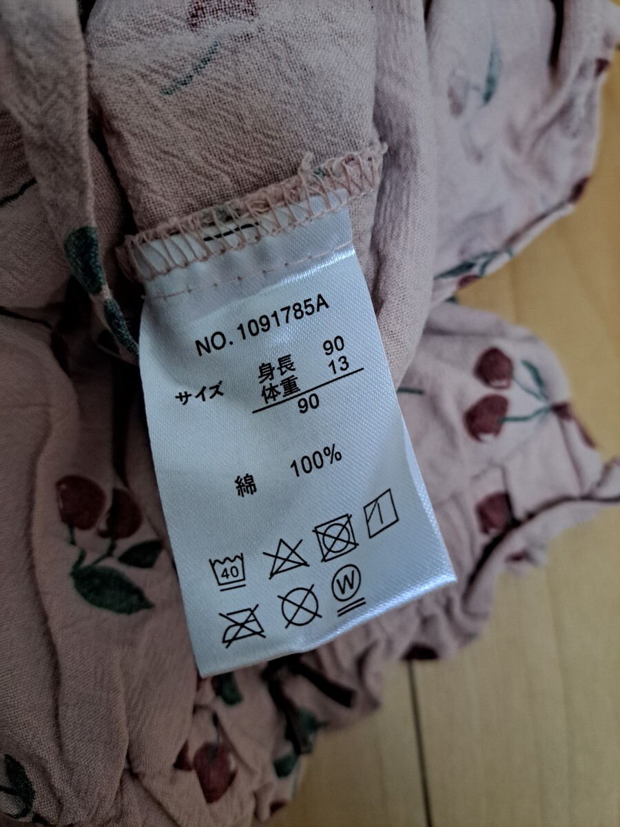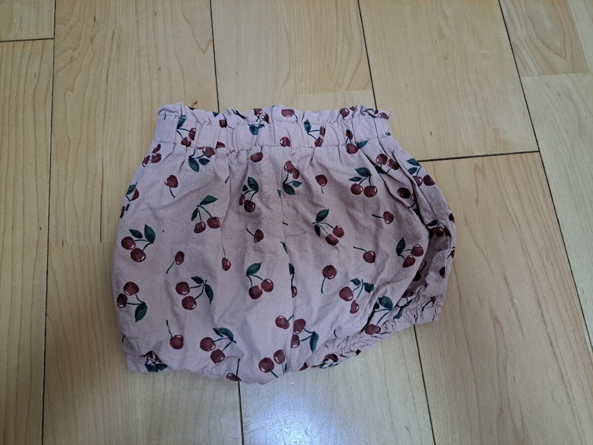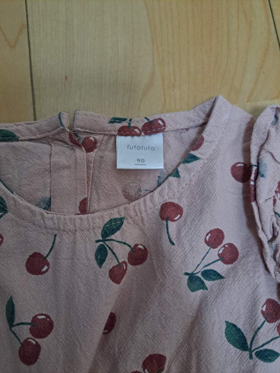 バースデーで購入しました、【フタフタ】の長袖カットソーとショートパンツのセットアップです。くすんだピンクのカラーで(画像よりはもう少し明るいピンクです。)小粒なチェリーの総柄です。凹凸の少ないサッカー生地のような素材で、肌離れが良く、さらっと着ていただけると思います。