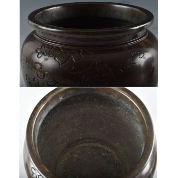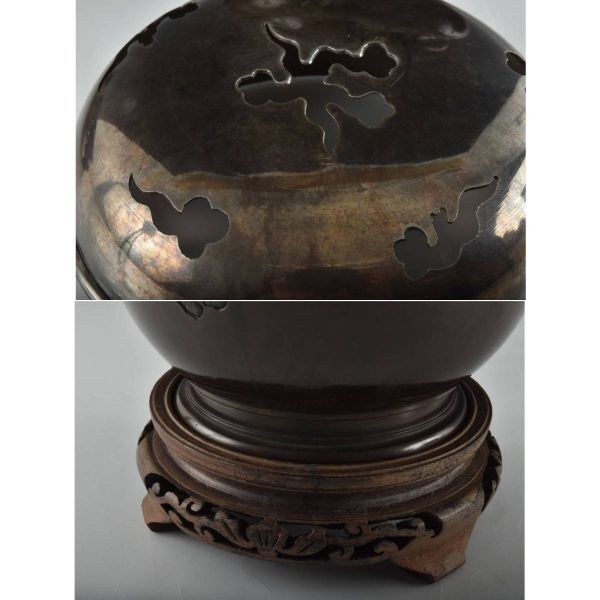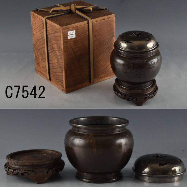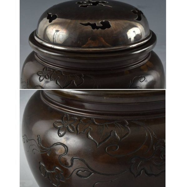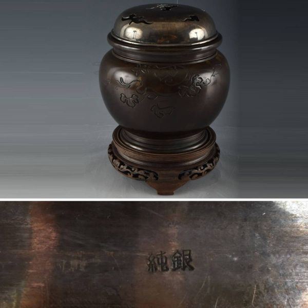 C07542 台付銅製香炉 純銀ホヤ84g:真作