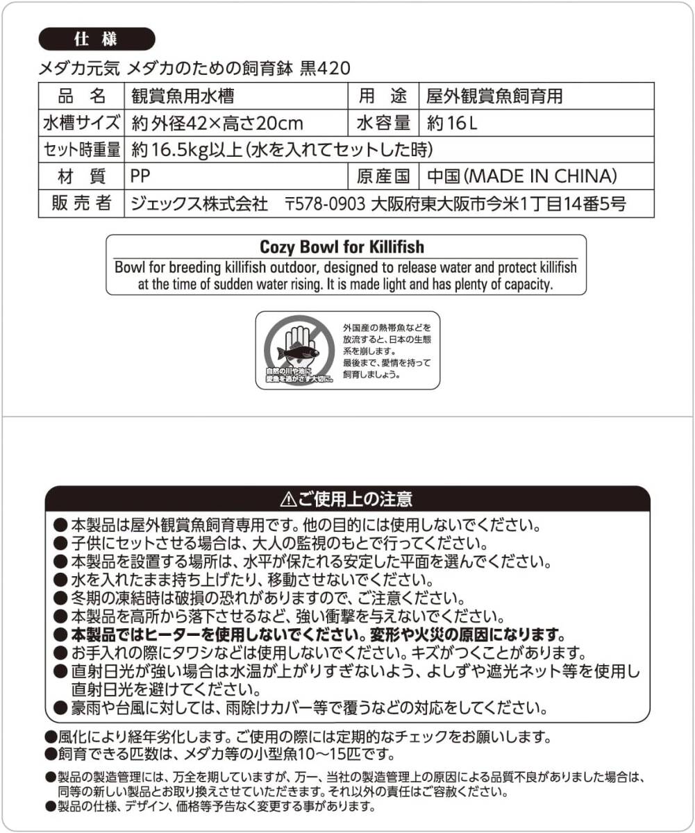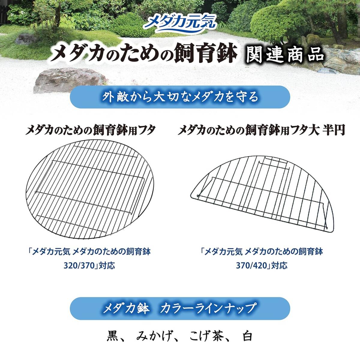 • 鳥獣被害の恐れがある場合は、別売の「メダカ元気 メダカのための飼育鉢用フタ大 半円」をご使用ください。 ●水位は、水抜け穴より約2cm下を目安に入れてください。 飼育できる匹数は、メダカ等の小型魚10-15匹です。