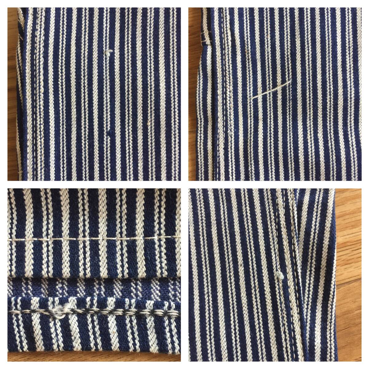 ● コンディション:デッドストック(未使用長期保管品)です。所々に生地特有のネップや、糸が出ています。うしろ、腰あたり、ヒップまわり、側面(両サイド)に日焼け、汚れ(シミ)がみられます。胸ポケットのスナップボタンに錆のような汚れがあります。大変古いアイテムと考えると、良好な状態を留めている様に思います。