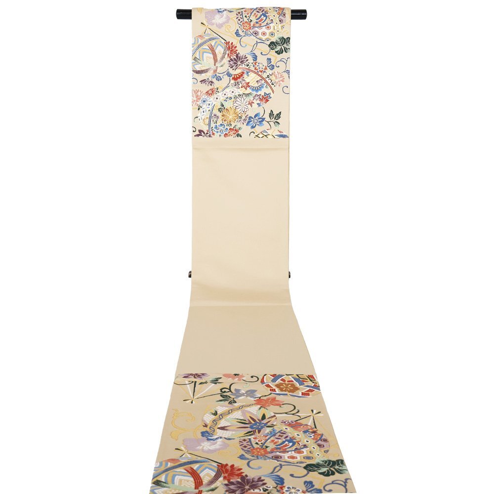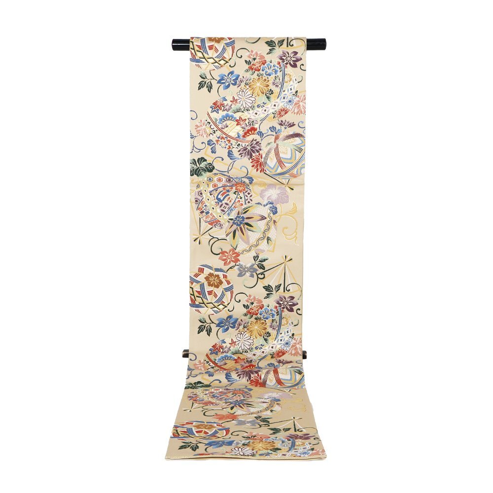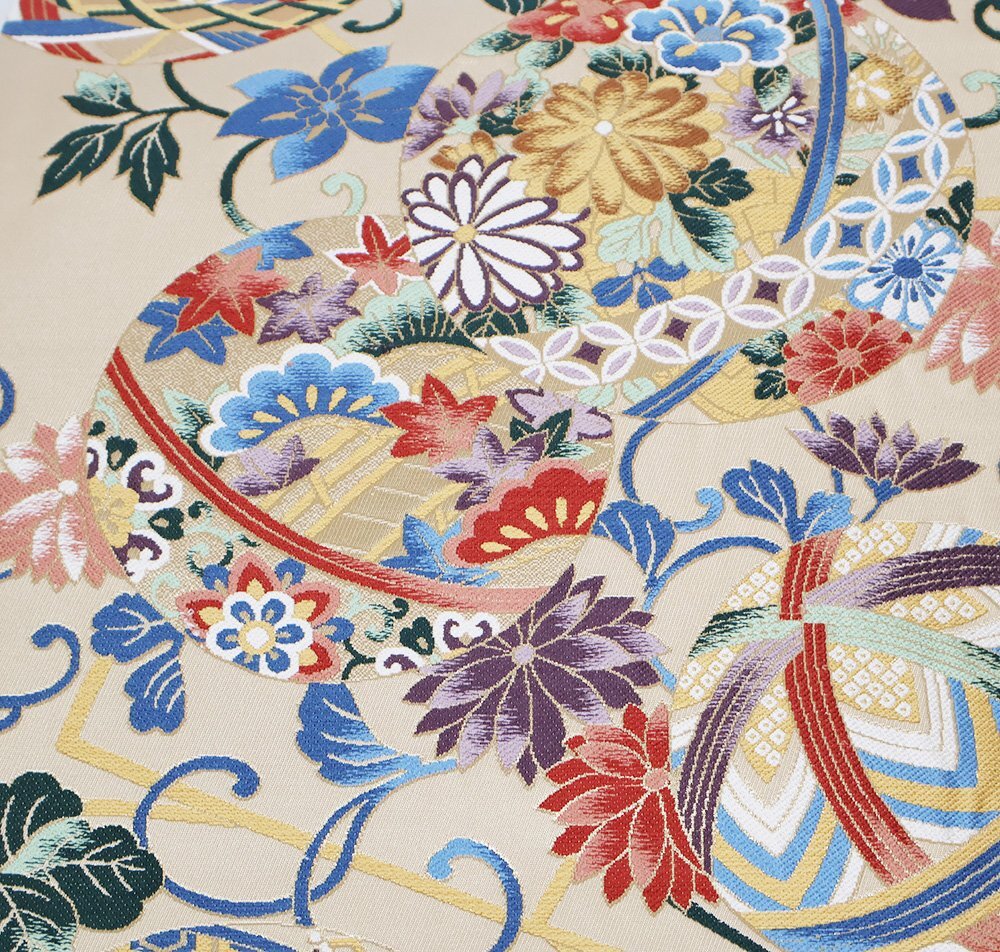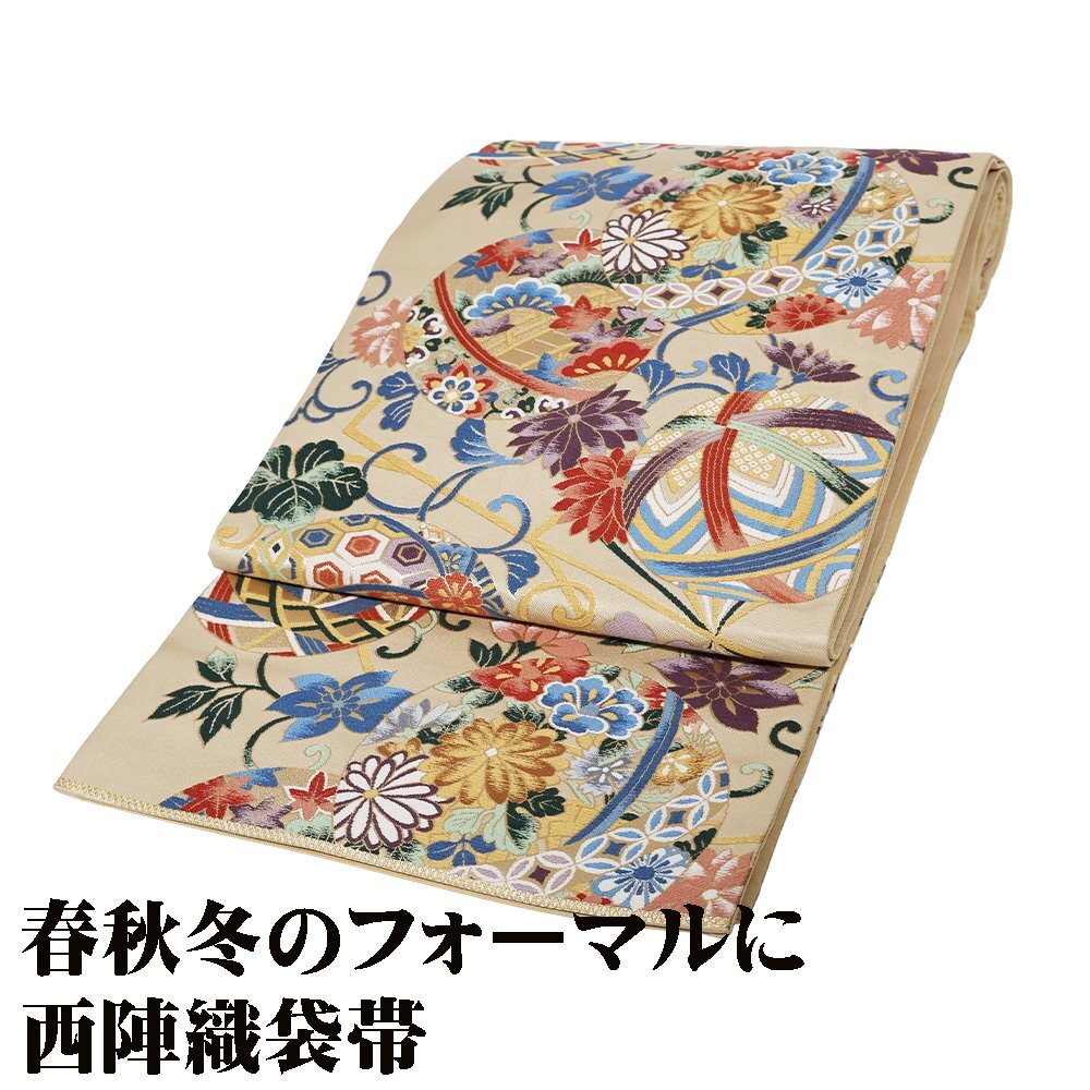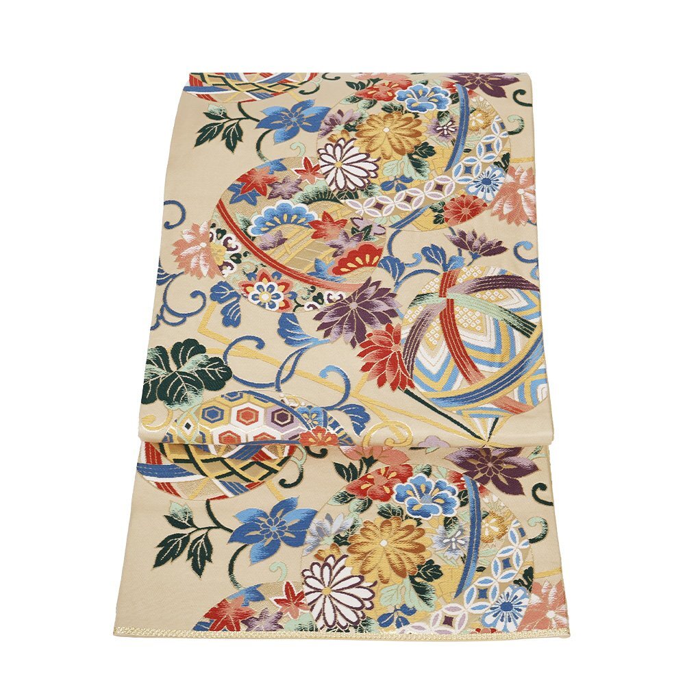 | 西陣織袋帯 ベージュ地 手毬 松竹梅・椿・菊・撫子・紅葉・唐花・華文 仕立て上がり |