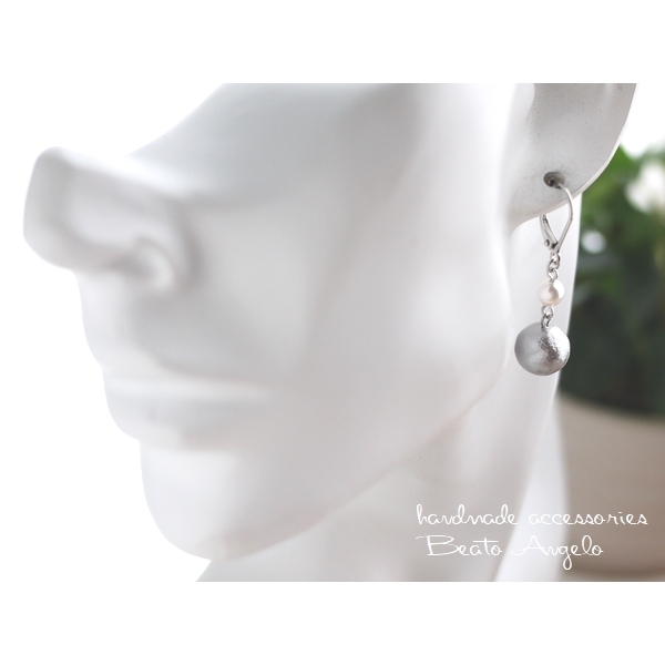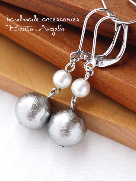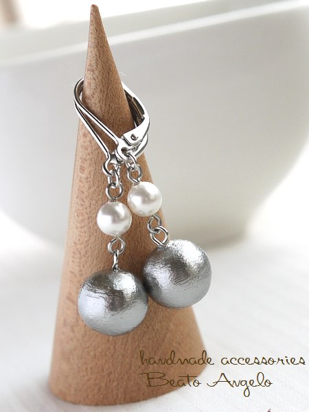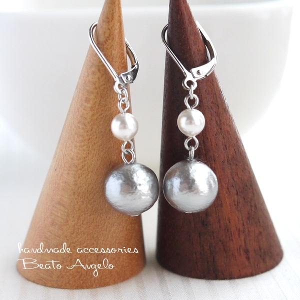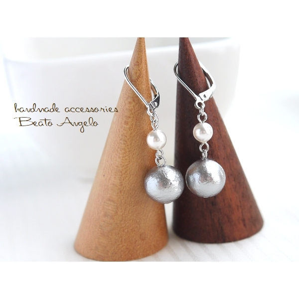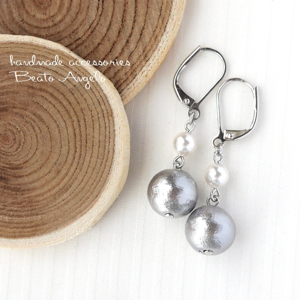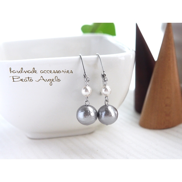 ◇◇+angelo+コットンパールとスワロフスキー パールのピアス(p-101)グレー S フレンチフック 10mm