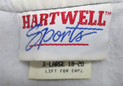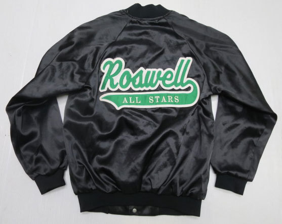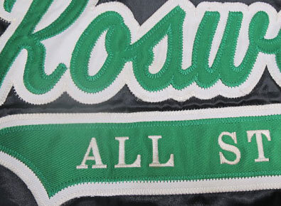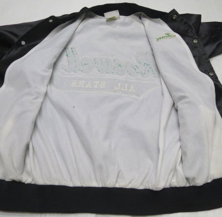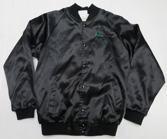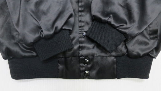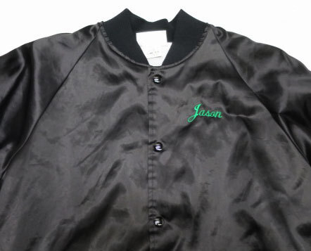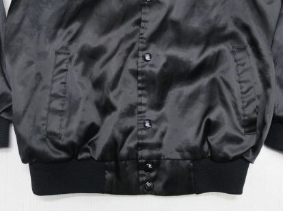アメリカ買い付けの90年代頃のアメリカ製HARTWELLベースのサテンジャケットで表地はナイロンの裏地はポリエステル(ネル地のような感じ)で右胸は文字刺繍の後はレタード貼り付けの黒です。