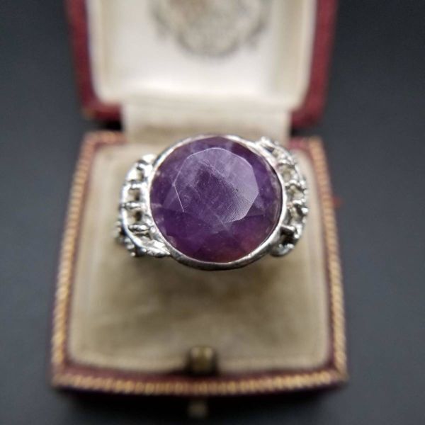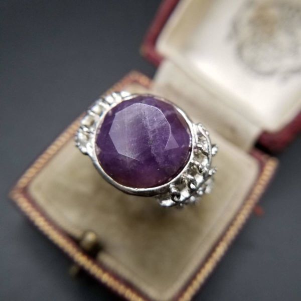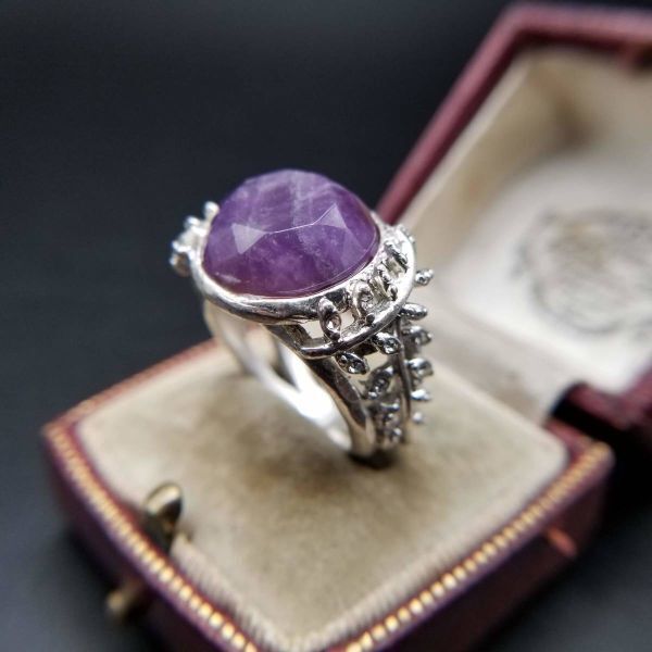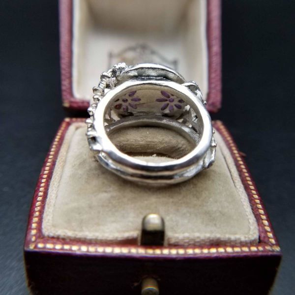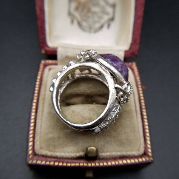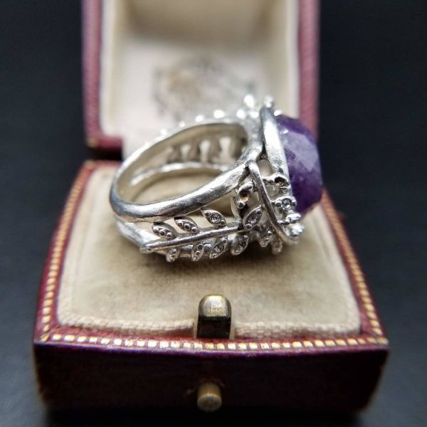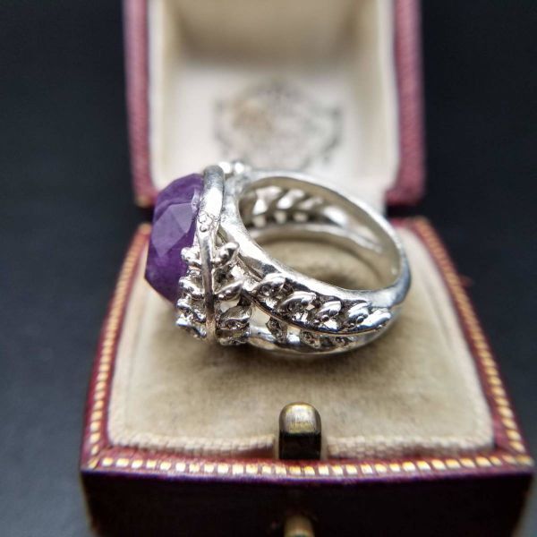 大粒 アメジスト ラウンドカット 葉っぱ装飾 ヴィンテージ リング シルバートーン 指輪 フローラル バンド 存在感 AU960