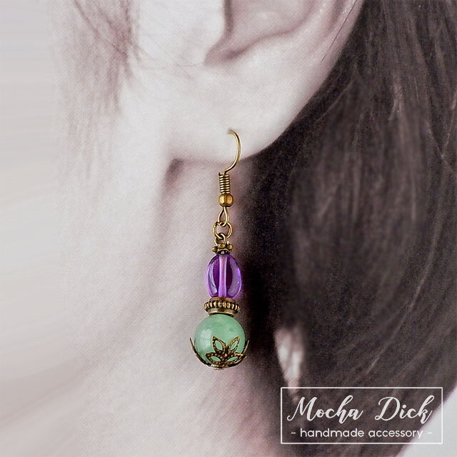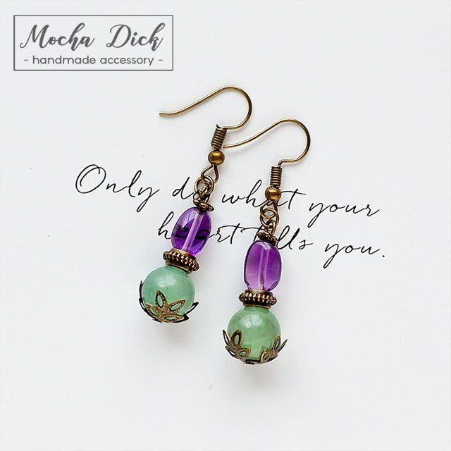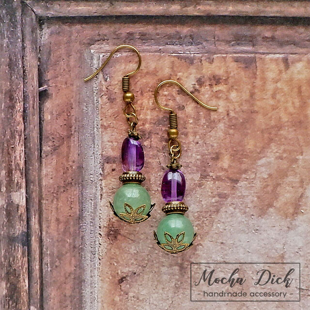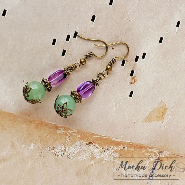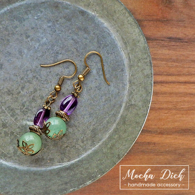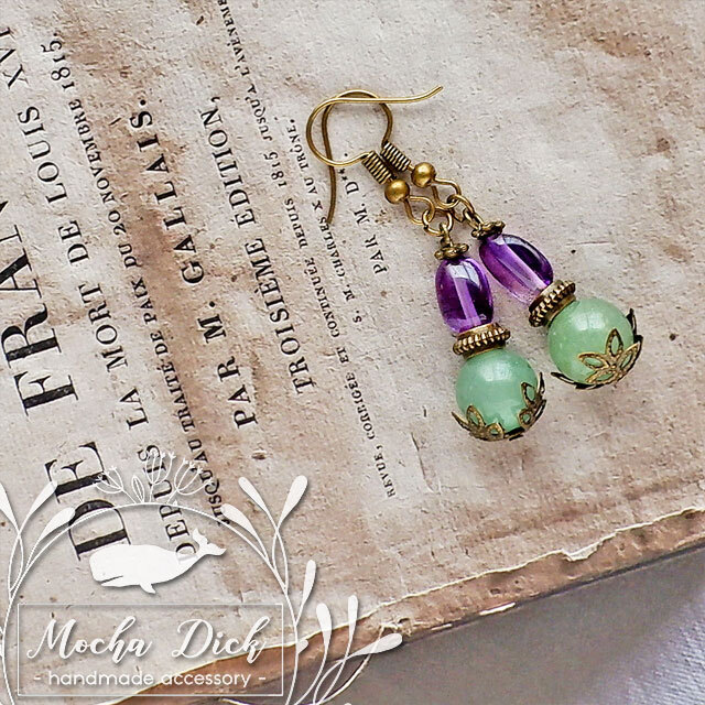 アメジストのタンブルと、グリーンカルセドニーの丸玉を組み合わせたピアスです。