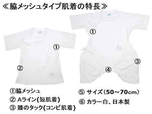 「エンゼル ベビー 短肌着 コンビ肌着 4枚セット 脇メッシュタイプ 新生児肌着 日本製 出産準備 出産祝い 50~70cm 綿100% 通年素材」▼4975520145448▼(商品説明)コンビ肌着・ホワイト ・・赤ちゃんのことを考えたやさしさ設計理想的なデザイン 赤ちゃんの足は「M」字型です。赤ちゃんの足は「M」字型です。短肌着は赤ちゃんにとって理想的なAラインデザインにしました。コンビ肌着は赤ちゃんにとって理想的なラインにしました。ヒザ部分にタックを入れてより動きやすい工夫をしています。赤ちゃんがはじめて身に着けるものだから、安心・安全の日本製にこだわりました。特に新生児時期は、顔色など赤ちゃんの変化に気づきやすいよう「白い肌着」がオススメです。・・お腹をしっかりガード 暴れてもお腹は出ません。赤ちゃんの体型にピッタリ調整エンゼルの肌着は「あわせ」部分が、一般的な肌着よりもたっぷり取ってあるので、少々動いてもお腹は出ません。エンゼルのコンビ肌着は股部分の真ん中にもボタンをつけ、はだけないようにしています。一般的なコンビ肌着はボタンがありません。・・通気性バツグン脇メッシュ素材なので通気性バツグンです。 汗っかきの赤ちゃんが快適に過ごせるように工夫されています。赤ちゃんは「バンザイ」パーズが基本。 脇部分に余裕がとってあるので、バンザイポーズでも「肌着は赤ちゃんのデリケートな肌に触れるものだから、いろんなメーカーの肌着を触りまくってエンゼルさんのに決めました私自身も敏感肌、夫もアトピーなので生地にはかなり厳しいのですが、こちらは本当に柔らかくてしっとりして素晴らしい生地を使っています。少しお値段はしますが、50~70のサイズで余裕があり、赤ちゃんの身体の動きを考えた形なので、長く使えることを考えると全く高くはないと思います。新陳代謝の活発な赤ちゃんを考えて脇メッシュなどの工夫も素晴らしいです。」「エンゼルの肌着は脇がメッシュになっている所が素晴らしい。50~70cmというサイズで長く着られる、季節を問わないところもいいです。」「いろいろな肌着を使ったけど、エンゼルの肌着は赤ちゃんも着心地が良さそうで使ってよかったです。」「他製品に比べ、生地がしっかりしていてしわになりにくく、短肌着は長め、コンビ肌着はボタンがとめやすく、使い勝手が良くてよく使っています。」「赤ちゃんの体型に合わせてすそ広がりになっていて、足をよく動かす我が子にはとても良かったです。洗濯を何回繰り返しても肌ざわりも変わらず、長く使えそうです。」「生地がしっかりしていることと50-70サイズで長く着れそうだったこと、脇が広くメッシュになっていて着替えやすそうだったのでこちらで購入しました。早く着せてあげたいです。」など愛用者が多いエンゼルのベビー肌着。生地もしっかりしていて洗濯を繰り返しても長く着られるという点が人気のポイント 素材:綿100%(フライス)サイズ:50~70cm(新生児~9kg)