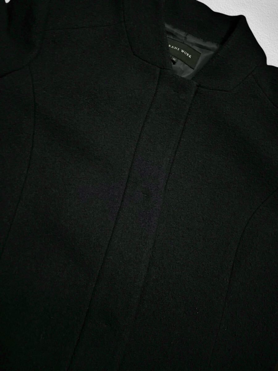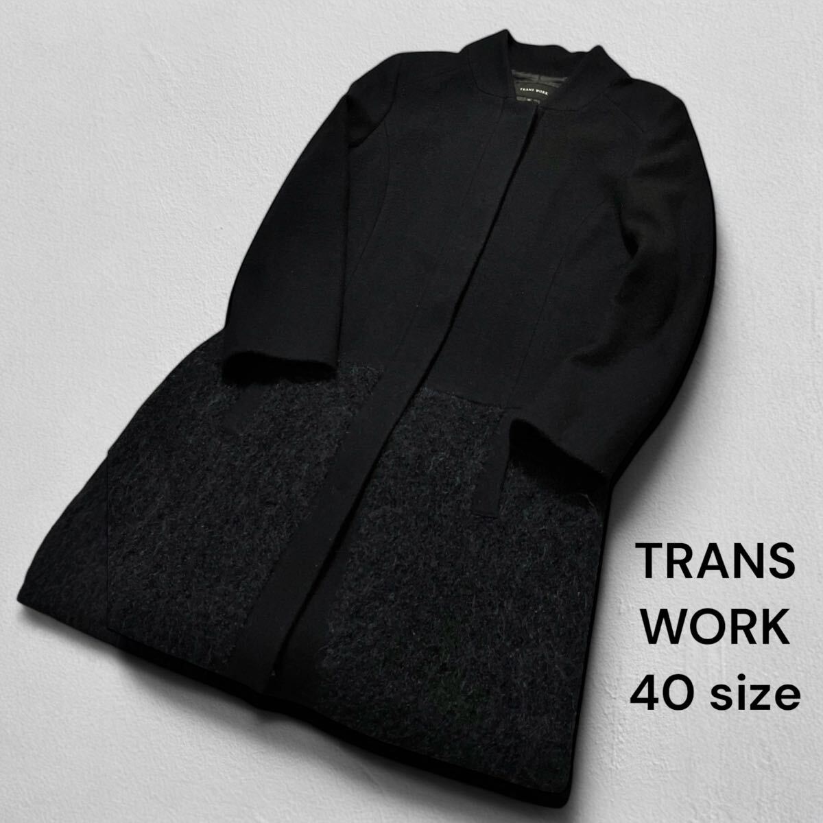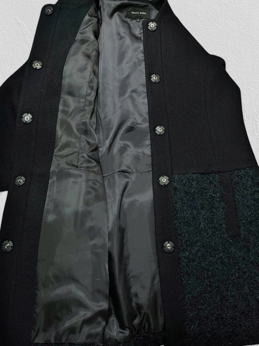 TRANS WORK ウールロングコート 40サイズ●洗濯プレス済●トランスワーク 毛70% スタンドカラー 切替 モヘア ブラック コート 古着/41