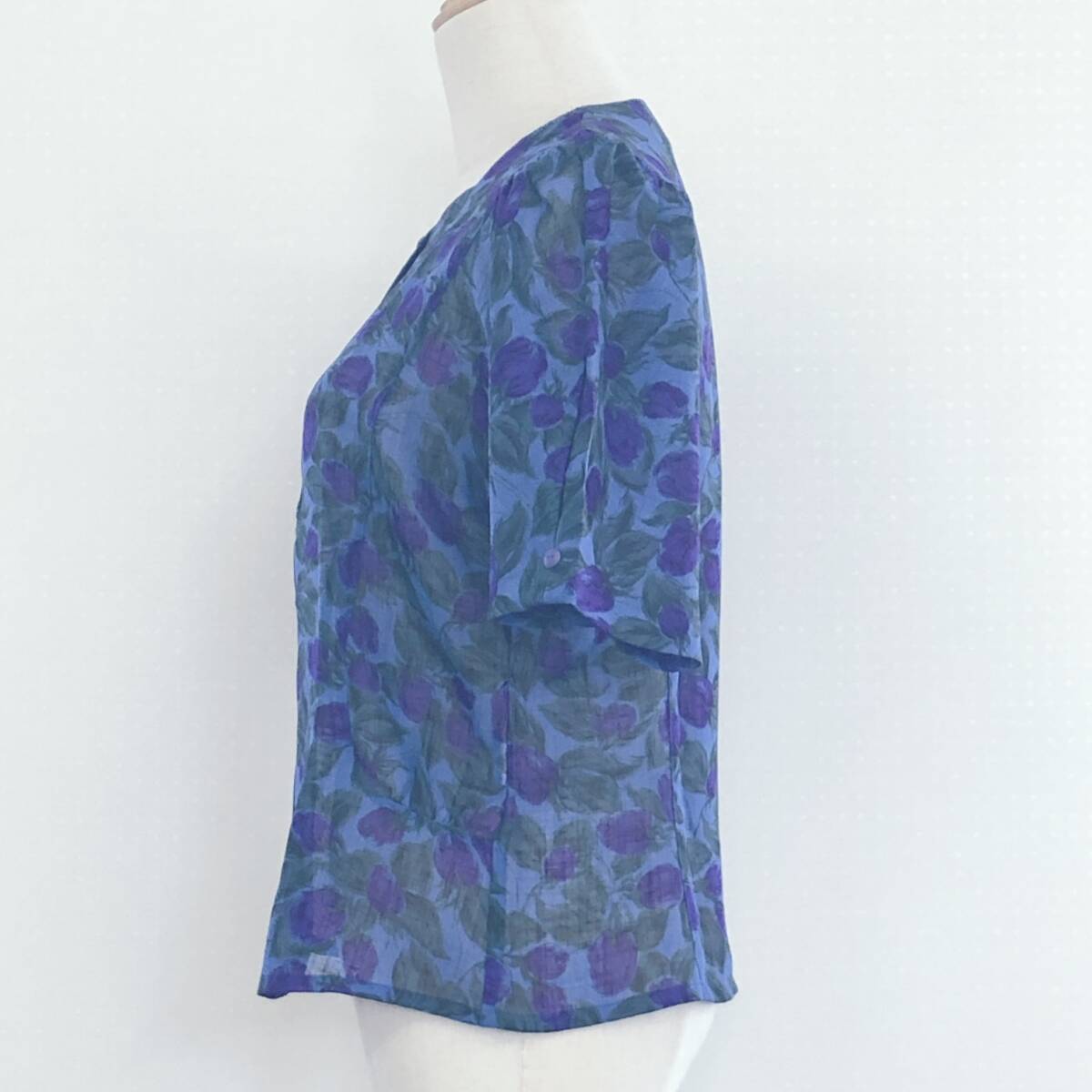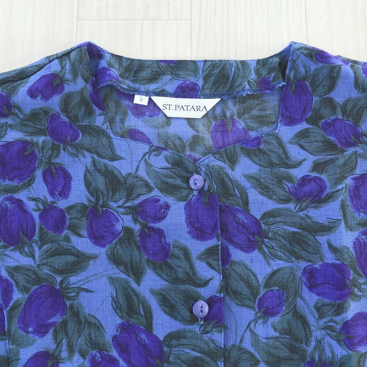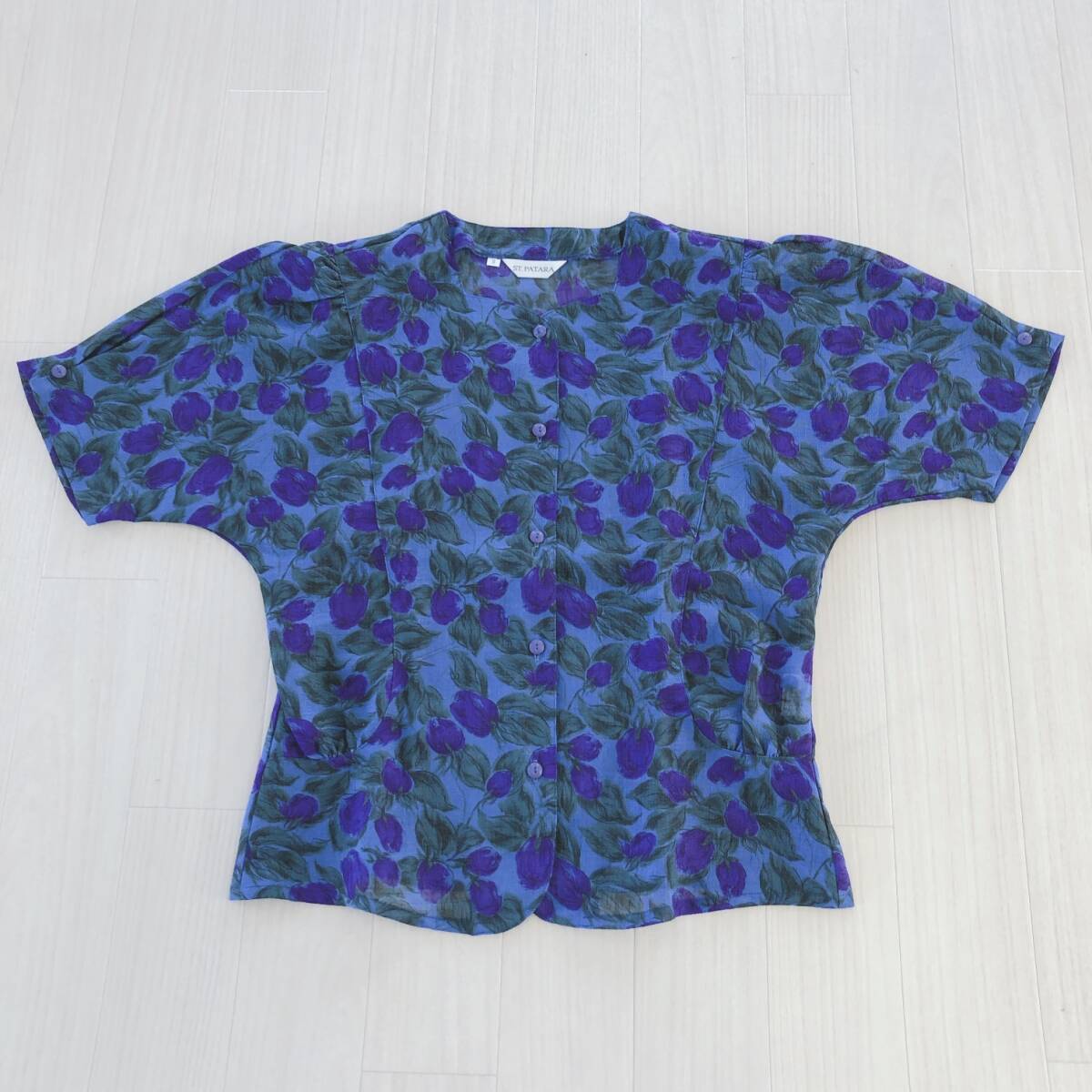 Y1335 美品 ST.PATARA レディース トップス ブラウス 半袖 替えボタン 薄手 肩パッド 9号 青緑 パープル 紫 花柄 上品 夏 ミセス