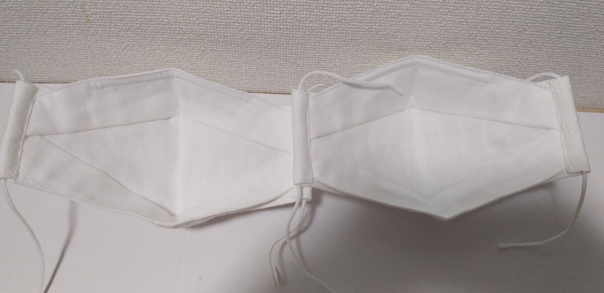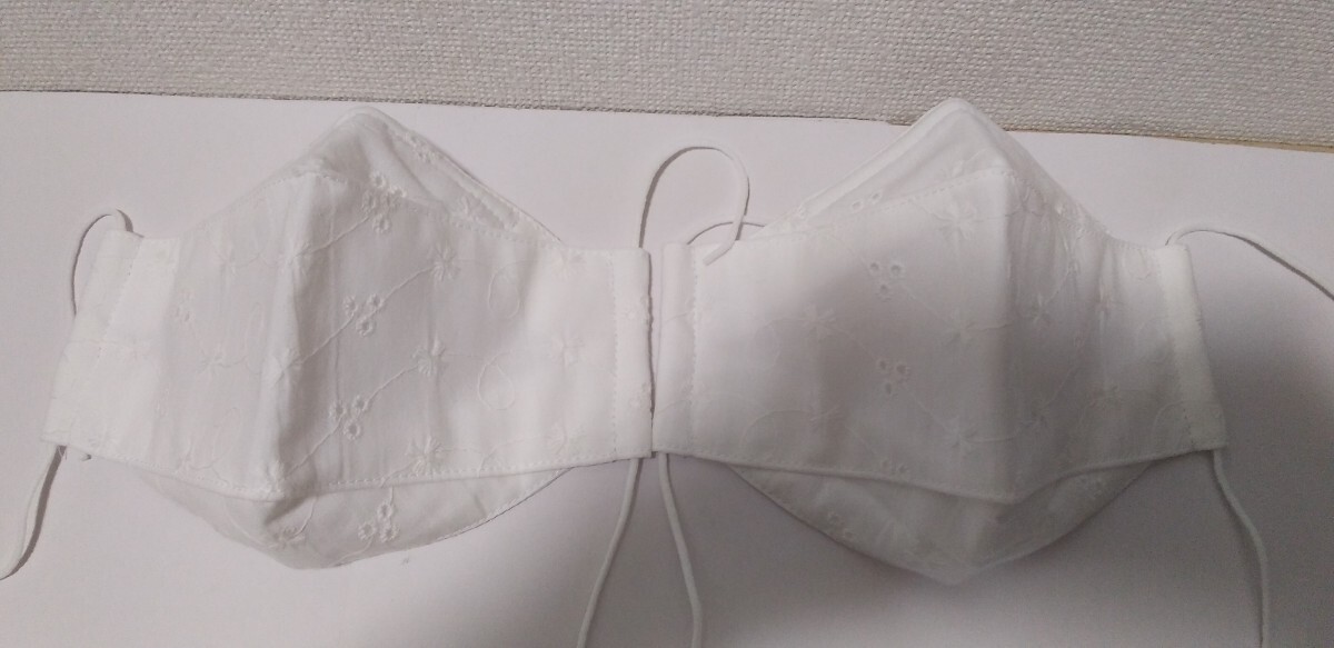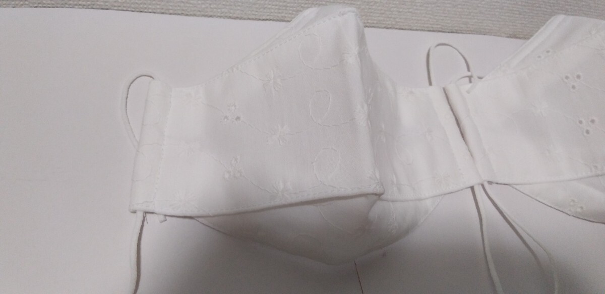 ハンドメイド  白色刺繍レース柄生地の3Dマスク2枚セットです。内側は白色のダブルガーゼです。両サイド紐通せて鼻部分にワイヤー入れてます。マスクゴムもお付けします。