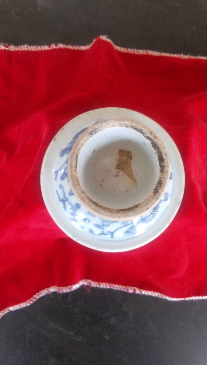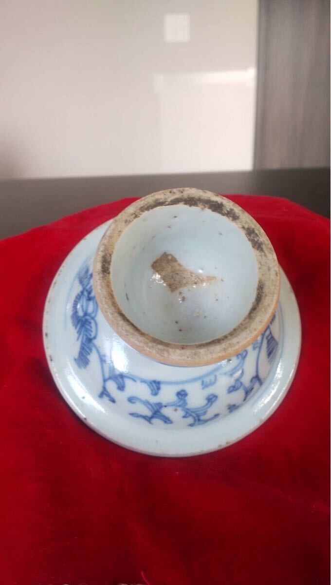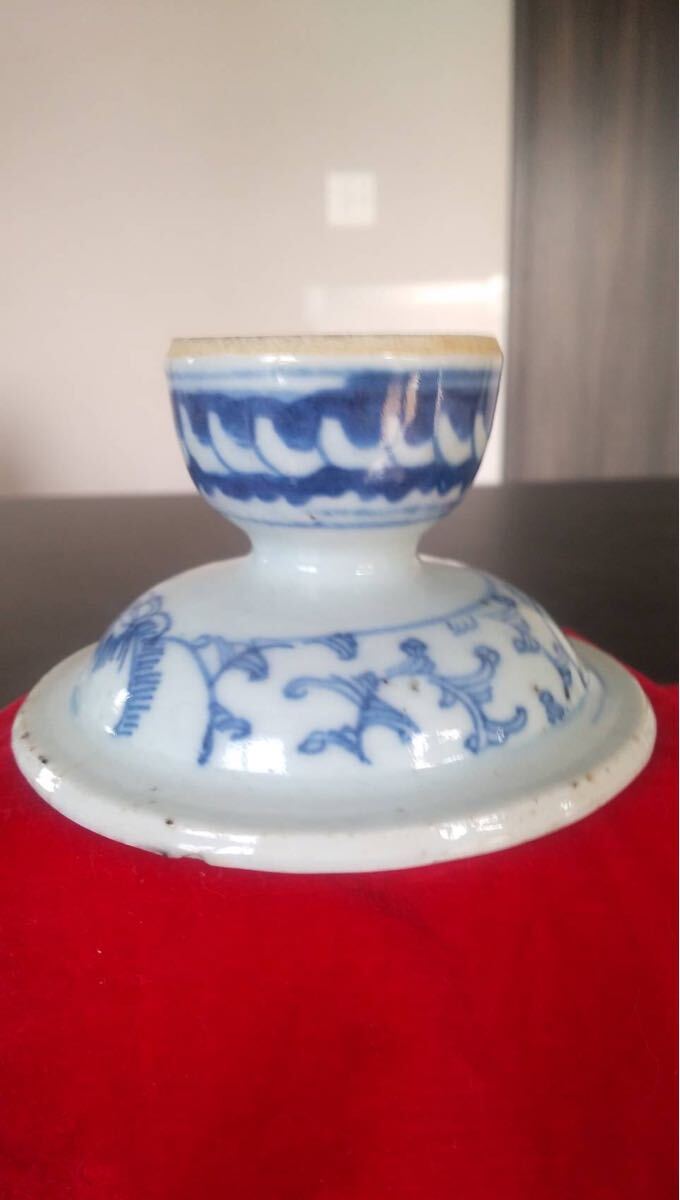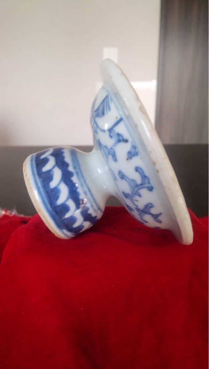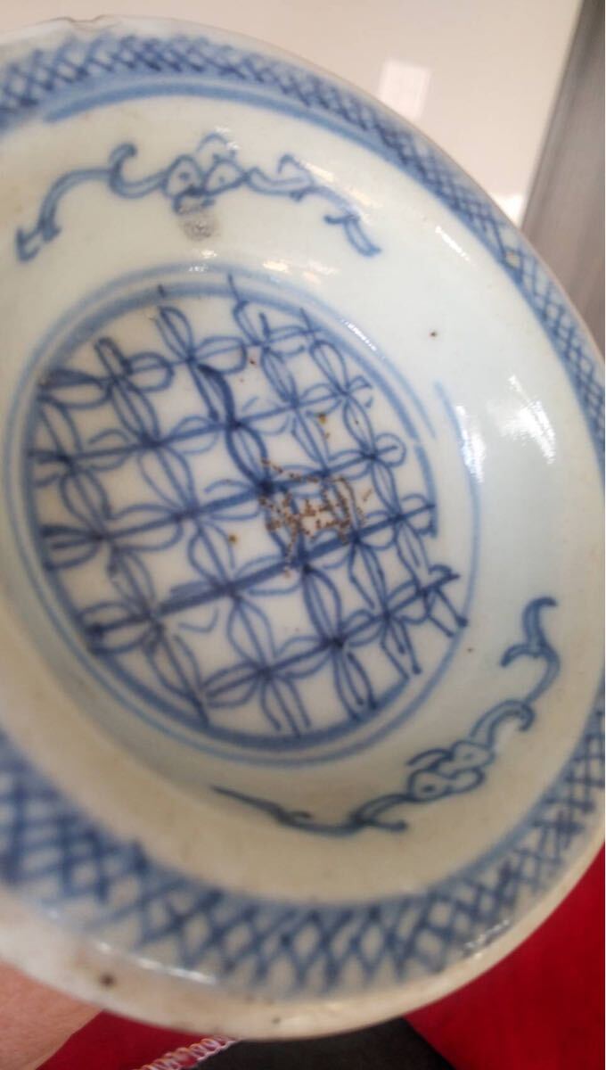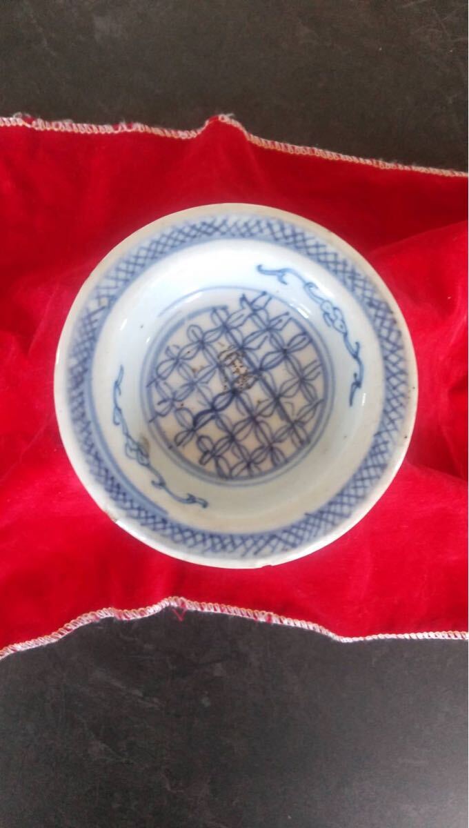 青花にて七宝模様が描かれております。小さなコンポート皿としてご使用はどうでしょうか。見込みに清朝時代の所有者の康という文字が点刻されています。