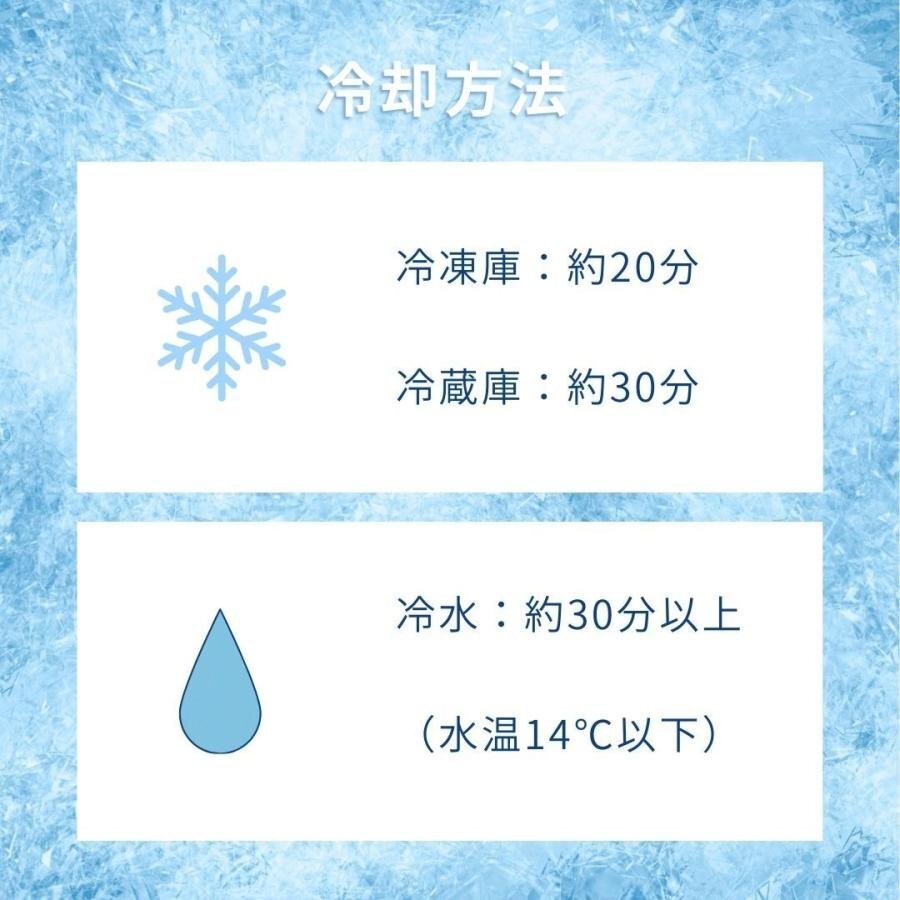 冷蔵庫や冷凍庫、氷水、冷水を使用して冷却し凍結させます。冷凍庫に入れておけば1-2時間、または冷水につけて約1時間、再び中身が固まりますので、急なお出かけの際にもすぐに冷やすことができます。