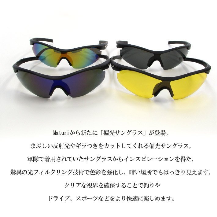 Maturiから新たに「偏光サングラス」が登場。 まぶしい反射光やギラつきをカットしてくれる偏光サングラス。 軍隊で着用されていたサングラスからインスピレーションを得た、驚異の光フィルタリング技術で色彩を強化し、暗い場所でもはっきり見えます。 クリアな視界を確保することで釣りやドライブ、スポーツなどをより快適に楽しめます。 テンプルは緩やかなカーブを描き、日本人の顔にフィットする設計。 ノーズパッド (鼻当て) は柔らかいゴム製なので、ズレにくく長時間つけていても痛くならないです。 フリーサイズ、ユニセックス。 ■カラー:レンズカラー:ブルーリボミラー(偏光)、フレームカラー:ブラック ■サイズ(約)レンズ横6.5cm×縦4.5cm、フレーム幅14cm ■重量:23g ■可視光線透過率:10.1% ■紫外線透過率:1%(UVカット率99%) ■素材:レンズ枠・プラスチック/テンプル・プラスチック ■付属品:専用ケース ※ケースは予告なく変更する場合がございます、予めご了承下さいませ。 ※ご覧のモニターやプラウザの設定、照明等により、画像と実物の色合いが若干異なる場合がございます。 ※製造上の過程により商品によっては細かな傷がある場合が御座います予めご了承下さいませ。 | |
