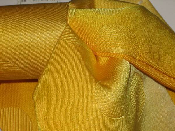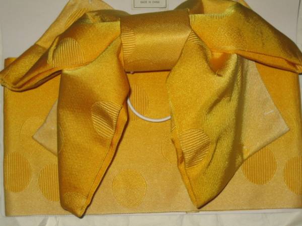 女性yukata用、地紋柄結び帯   黄ぼかし ポリエステル  新品(織り地紋柄ありです。波状の写りはレンズの光学的ないたずらで現品にはありません、また薄く濃く写っている場合もあります)、胴部--帯巾約16,5cmx長さ約130cm、リボン部は横に約30cm。見た範囲で汚れないと思いますが、着用に差し支えない薄汚れ(多分ない?)はあってものお値段で出品です。