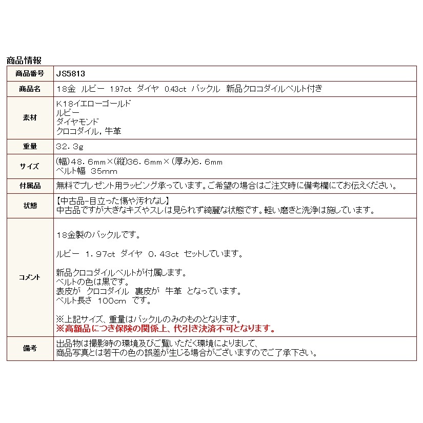 | 商品名 | 18金 ルビー 1.97ct ダイヤ 0.43ct バックル 新品クロコダイルベルト付き |