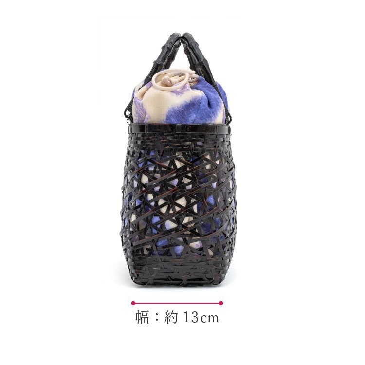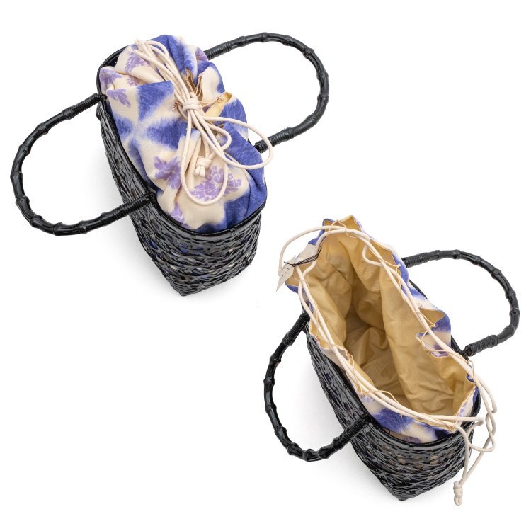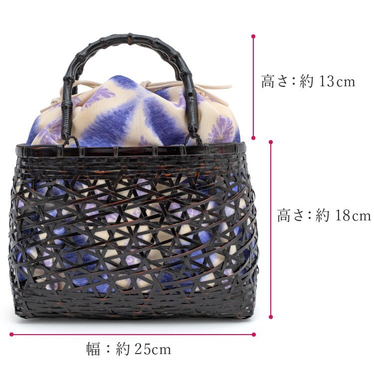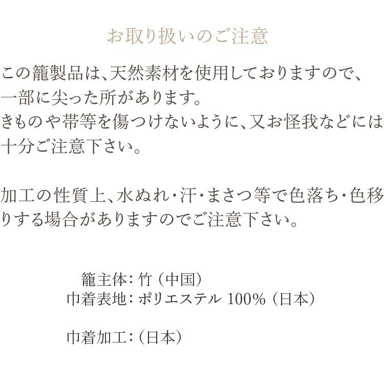 籠主体:竹(中国) 巾着表地:ポリエステル 100%(日本) 巾着加工:日本 この籠製品は、天然素材を使用しておりますので、一部に尖った所があります。 きものや帯等を傷つけないように、又お怪我などには十分ご注意下さい。 加工の性質上、水ぬれ・汗・まさつ等で色落ち・色移りする場合がありますのでご注意下さい。 |