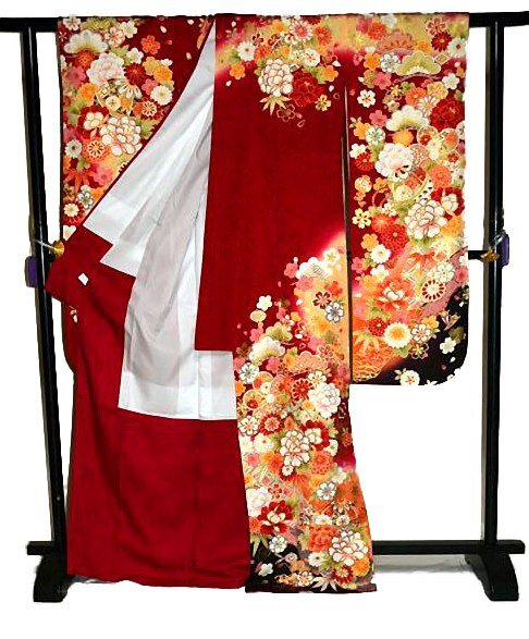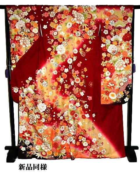 振袖 中古 送料無料 身丈170cm 裄丈67cm 最高峰 新品同様 暈し染め 金彩 金駒シシュウ 花尽し 舞桜 毬 宝尽くし 赤 正絹 成人式 T3474