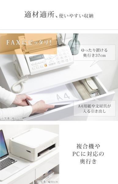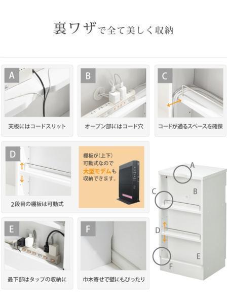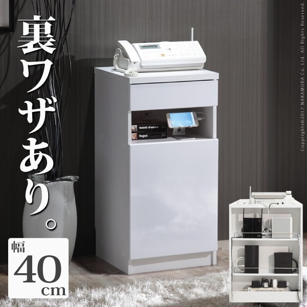 『背面収納スペース』がポイントのFAX台 「FAX台」として人気のキャビネットがさらに使いやすくなって新登場! 「裏ワザあり」の配線収納付きです。 複合機やPCに対応の奥行きをもたせ、人気シリーズのロビンと並べてもスマートに配置できます。 「鏡面」「白」は、どんなお部屋にも合いやすいシンプルなデザインです。 | |||||