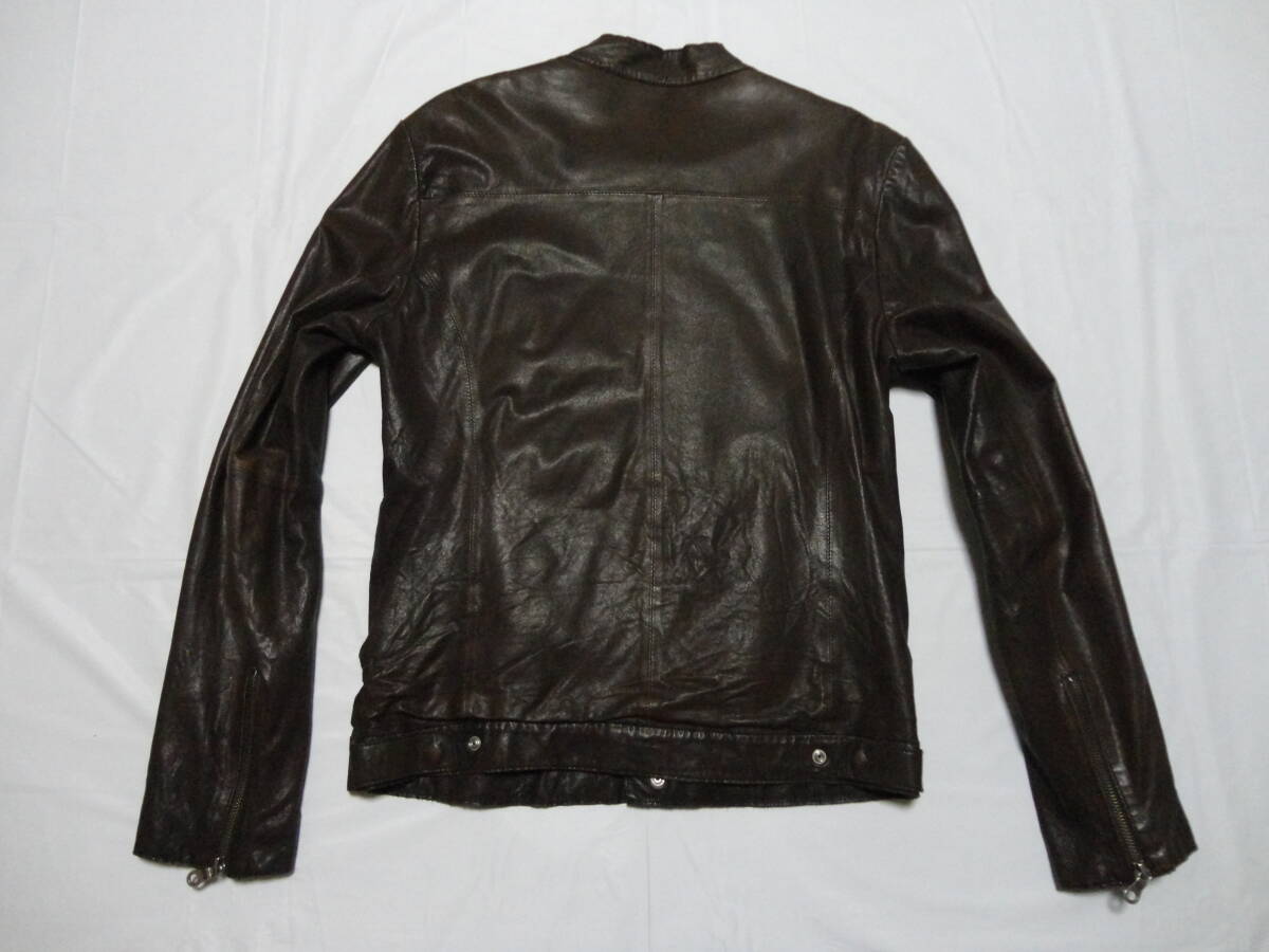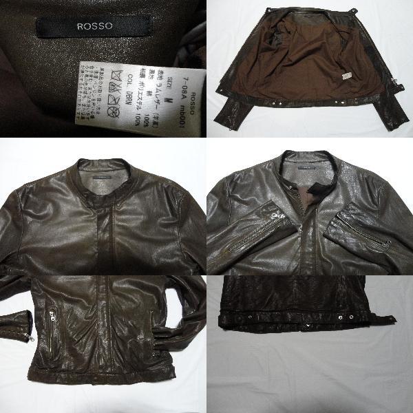 全くクセのない、シンプルで非常に人気のあるデザインですが、無骨な色合いが男らしく印象的で、カッコよくラフに洗練された雰囲気の、ロッソの羊革のシングルライダースレザージャケットです。