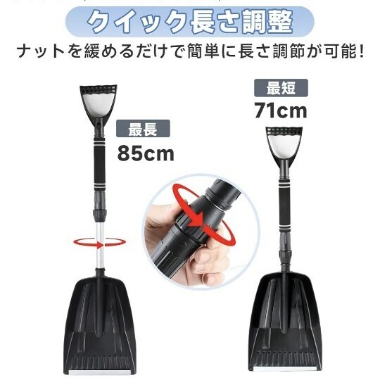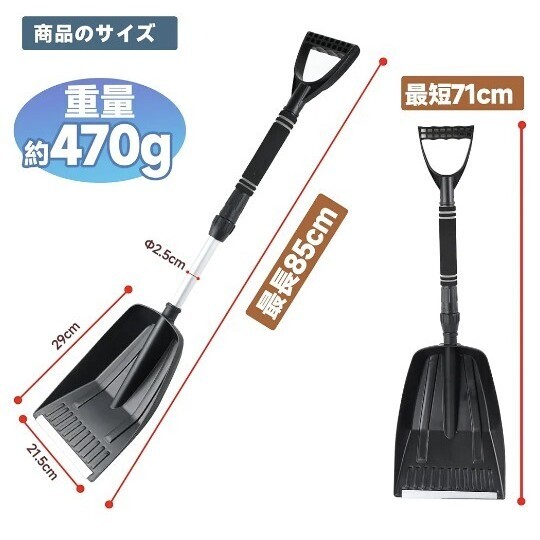 【商品内容】雪かきスコップ-本体【商品重量】約470g【商品サイズ】シャベル本体:長さ約29cm×幅約21.5cm、全長:最長約86cm、最短約71cm【商品材質】:シャベル本体+ハンドル:ABS+PP樹脂、ショベルヘッド+延長チューブ:アルミニウム合金、ハンドルパッド:EVAスポンジ