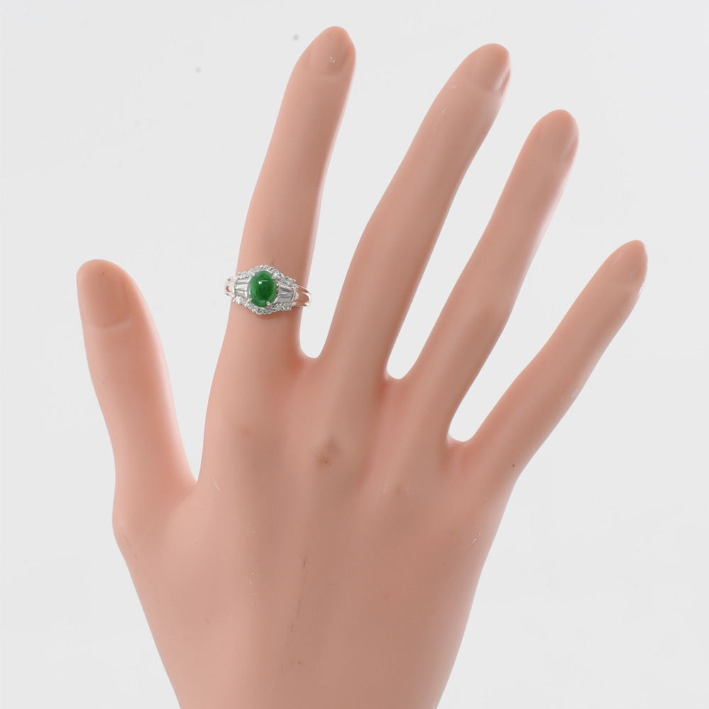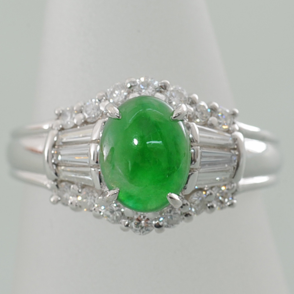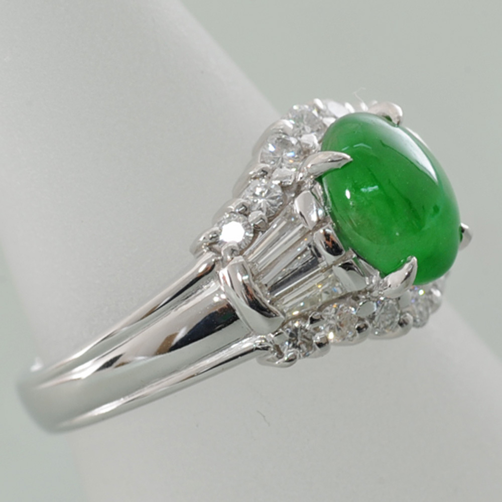 ● 材質:プラチナ900、ひすい1石(オーバルカボッションカット)、テーパダイヤ6石、メレダイヤ14石